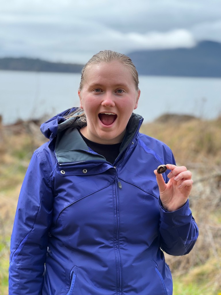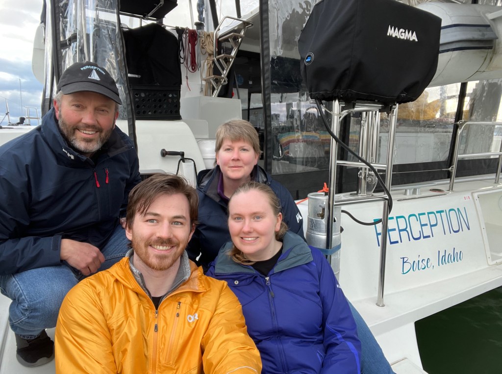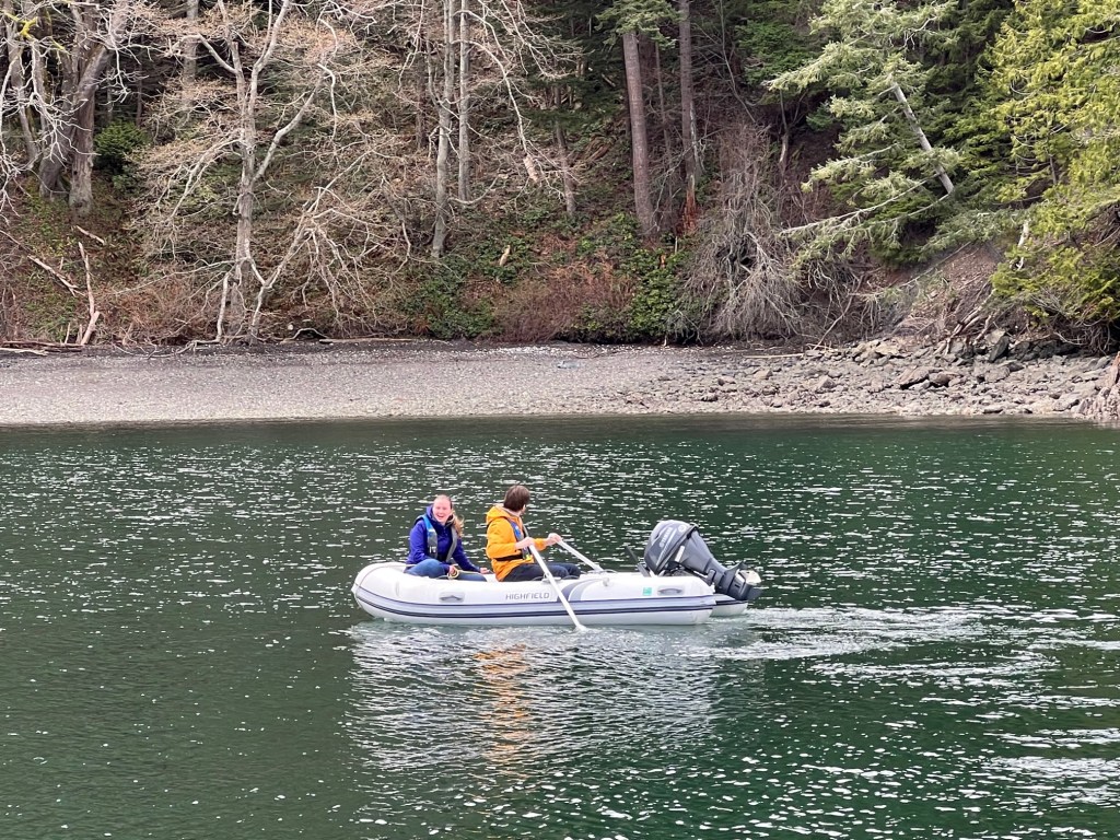 We kicked off the month with a visit from our daughter, Sarah, and her boyfriend, Max. The weather did not cooperate for our broader plans, but a 12-hour window between gales allowed us safely out for a day trip. It was new territory for all of us visiting Vendovi Island Preserve for the first time. On the way back, we stopped by Inati Bay on Lummi Island and they took the dinghy out to get a closer look at the waterfall. (Melinda)
