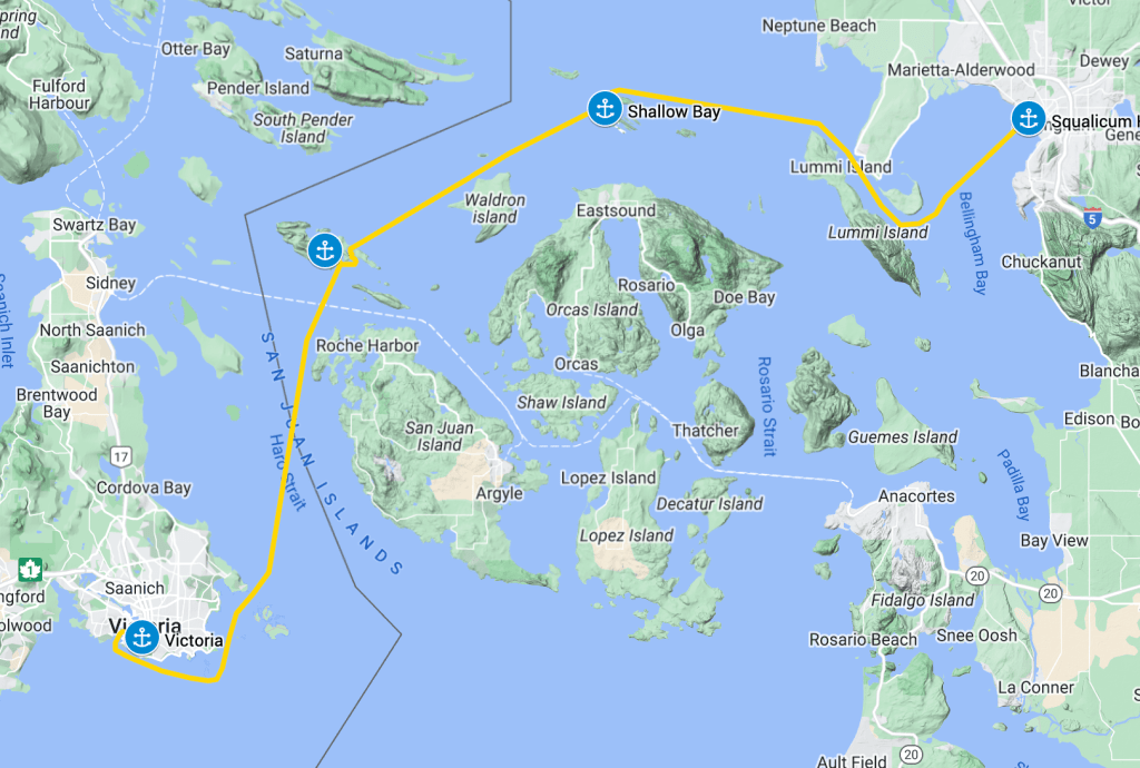 Our experience with the US Customs and Border Patrol was a bit different this time. We have been happily using the CBP Roam application for a few years now, which has allowed us to clear in from the boat as soon as we cross the border from Canada. We’ve had responses from CBP that are as simple as an “accepted” message with a confirmation email, up to a one-way video call with an agent. This time I cleared in from the helm as we crossed the Haro Strait without informing Melinda, and received a confirmation by email. A minute later Melinda popped out of the saloon on the phone with a CBP agent. When I submitted our arrival the form had listed her as the “master of the vessel”, so they called her number with the typical questions about where we’d been and what we were bringing into the country. They also noted that my submission had last year’s CBP tag number (the new one was waiting for us in Boise), so gave us the new one. Every time is a bit different, but it sure has been nice not needing to clear in at a physical location!