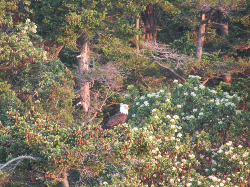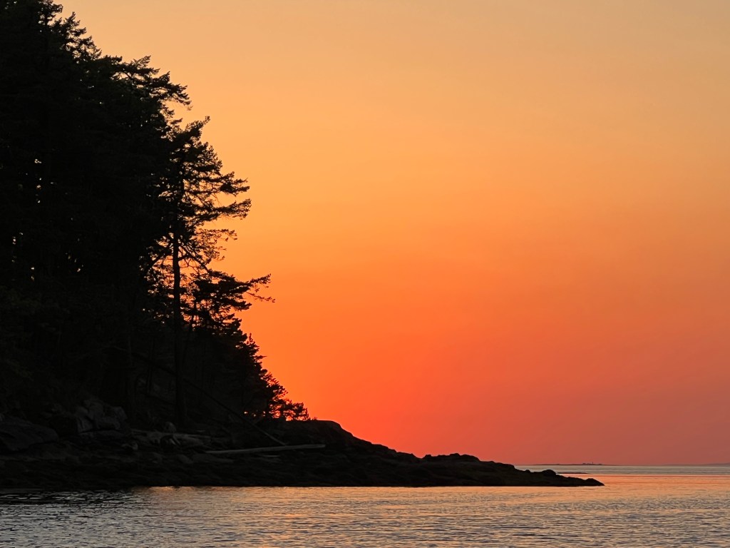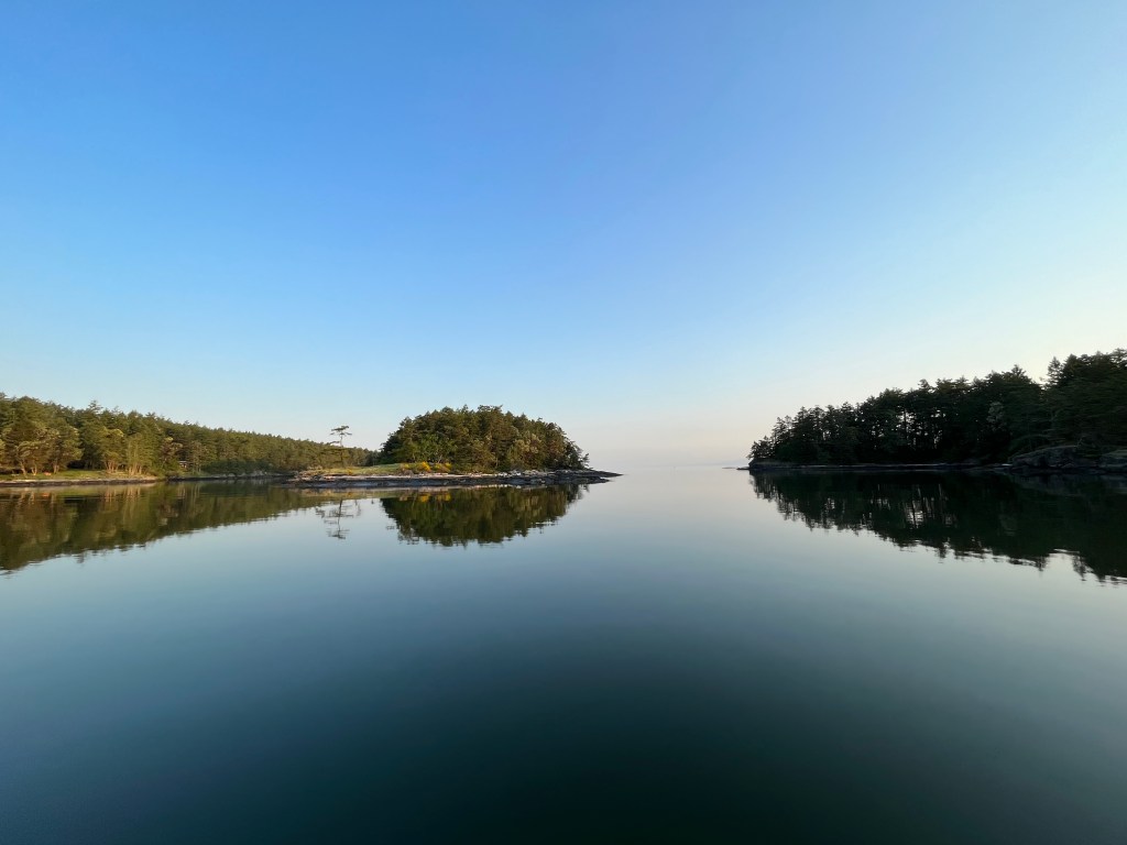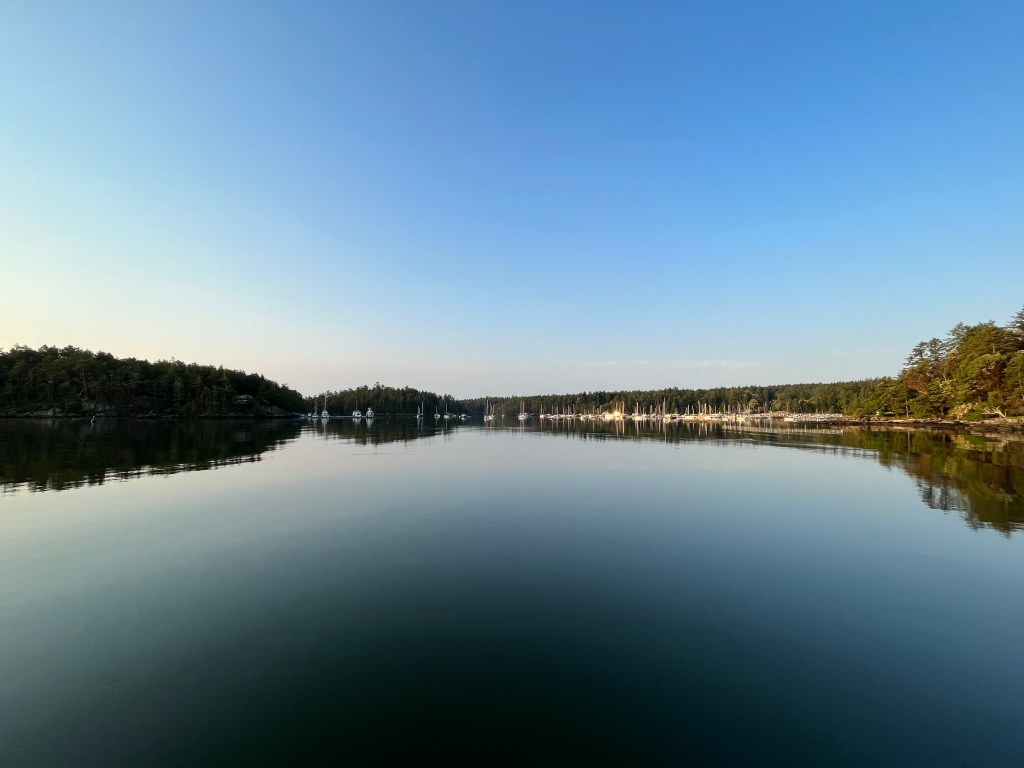 We found Silva Bay to be as crowded as the guidebooks said it would be. The bay in front of the marinas was absolutely packed with boats on mooring balls, way too tight for my comfort level to anchor in the gaps. As an alternative we decided to anchor in the open area outside the bay. Winds were projected to be minimal overnight, so we hoped the open channels to the Strait of Georgia wouldn’t funnel swell in on us. We were rewarded with a very calm night, a beautiful sunset, and a visiting bald eagle in the morning.
