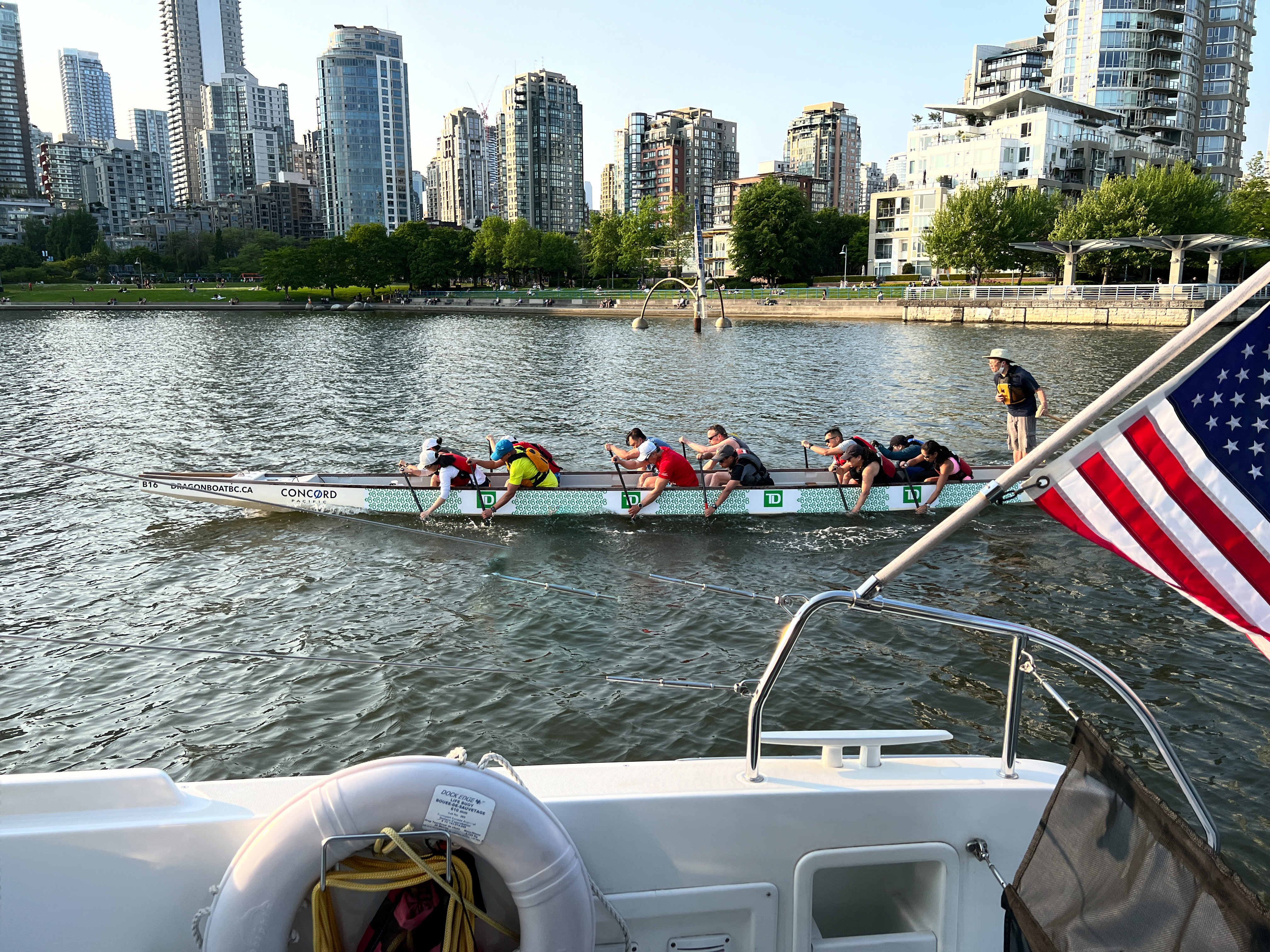 Our anchorage provided endless entertainment as well. Water taxis zipped by ferrying sightseers around False Creek, and sunset cruise yachts motored by in the evenings – often carrying a wedding party. Vancouver hosts a world-renowned dragon boat festival in June and teams were earnestly practicing their skills every evening. Canadian Memorial Day gave folks an extra day of the weekend to enjoy the sunny weather on the water, so there were also lots of paddle boarders, canoes, and sculling crews. Occasionally a Bayliner with big speakers would troll by or throw down an anchor a little too close for our comfort, but all in all it was a great place to hang out. (Melinda)