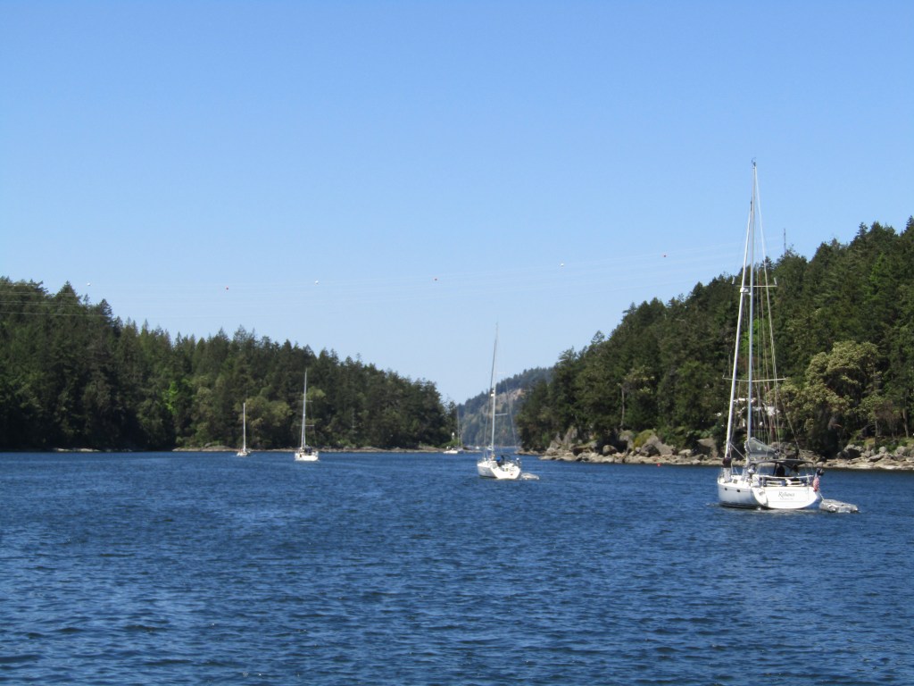 We noted that a flotilla from San Juan Sailing was in the harbor as well, mostly on the dock. We’d talked with the flotilla leader a few days back about their trip to Princess Louisa Inlet, and by happy coincidence were on the same path for the first part of our journey. Sunday morning as we prepared to leave we started seeing the SJS boats pull out of the harbor, and ended up in their wake as we rounded the southern end of North Pender Island.