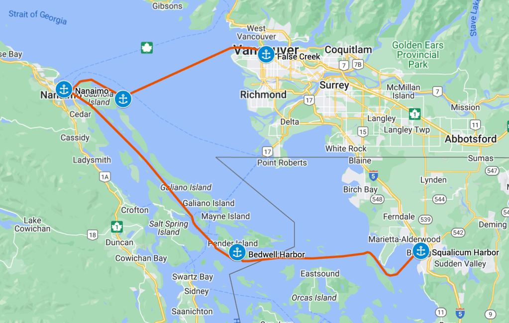 We stayed two nights in Nanaimo since Monday was a full day of meetings for me. I’d considered trying to head across the Strait of Georgia to Smuggler’s Cove as our next stop, but I was nervous about my ability to use Starlink underway. It would also put us quite a ways north of Vancouver, which would feel like backtracking. Monday and Tuesday are my busiest meeting days of the week, and we’d be constrained to moving after 5 PM if I didn’t work underway. In the end we decided to head the short distance to Silva Bay Tuesday after the work, which would set us up well for a crossing to Vancouver on Wednesday afternoon.