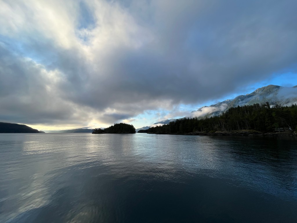 Needless to say, it was still pretty nasty in the strait and we immediately tucked into Blenkinsop Bay. Our new location didn’t seem much of an upgrade. I’d hoped for some protection from the 20+ knot winds now whistling down the Johnstone, but they carried right across Point George and into the harbor. I suspect it may have been an acceleration zone for wind rushing around White Bluff. Regardless the bay was not a good shield for the winds. On the plus side, the swell was reduced and we had a large area in which to anchor and swing. We put out a large scope and settled in for the night with the wind howling through the rigging.