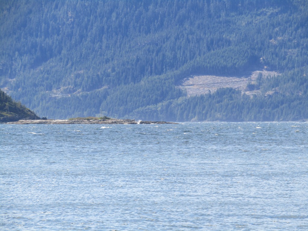 Friday morning presented us with the challenge of heading west up Johnstone Strait. I wanted to wait until my morning meeting ended as well as letting the tide turn to ebb to see if the strait looked bad in that condition. It looked just fine, so we left the snug North Cove for the open strait. Things went just fine in Current Passage, but when we rejoined Race Passage on the west side of Helmcken things got interesting. We hit the nasty ebb current against a westerly wind, generating those steep, choppy waves that everyone warns about. We slowed to a crawl and pushed on up the strait.
