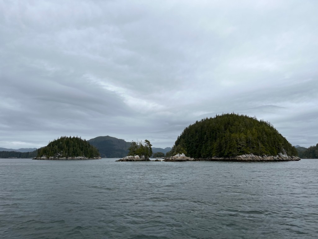 We tucked into the Broughtons turning north from Knight Inlet in front of the Ridge Islets. The black and white of the rock faces on the islets was striking against the green trees topping them.