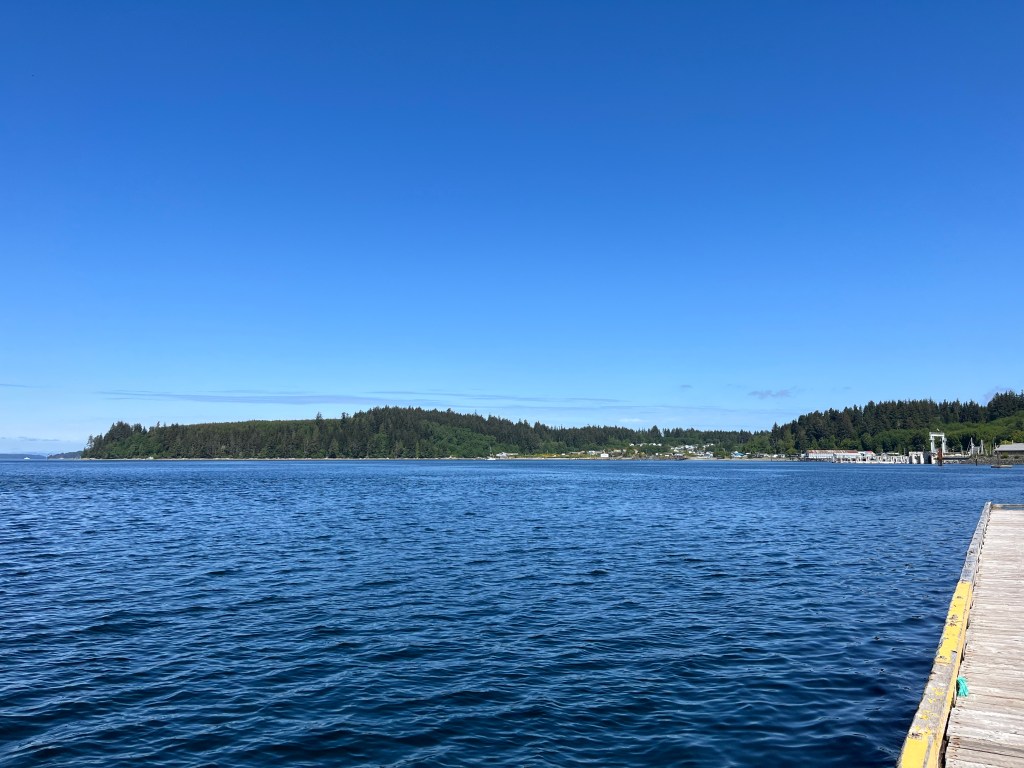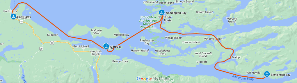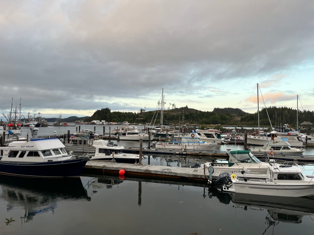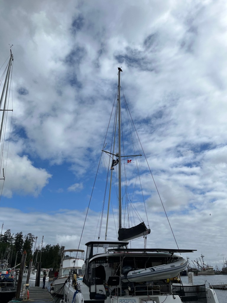 Having seen what we could of Alert Bay, we piled back into the dinghy and headed out to Perception, patiently waiting at anchor. As we were early departing due to the power outage, we changed our destination for the day. We’d originally planned to go to Port McNeill, which was relatively close to Alert Bay. There we intended to fuel and provision, staying for a couple days to catch our breath before approaching Cape Caution. Since. were early, we decided to press on a bit further up the coast of Vancouver Island to Port Hardy. This would set us up to take less of a beating getting across Queen Charlotte Strait for the next leg of our journey.