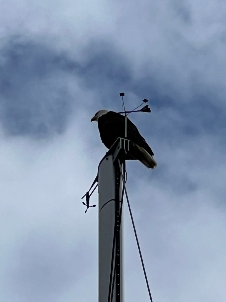 We spent two days in Port Hardy, and it was nice to have a day without moving after making some good progress to the northwest from Vancouver that week. We were entertained by a bald eagle taking a liking to our tall mast in the harbor – at least until I discovered that he’d roosted there overnight, leaving behind a job of deck cleaning for me! We also saw our first sea otters up close here, after passing a rack of them in the strait on the way up from Alert Bay.