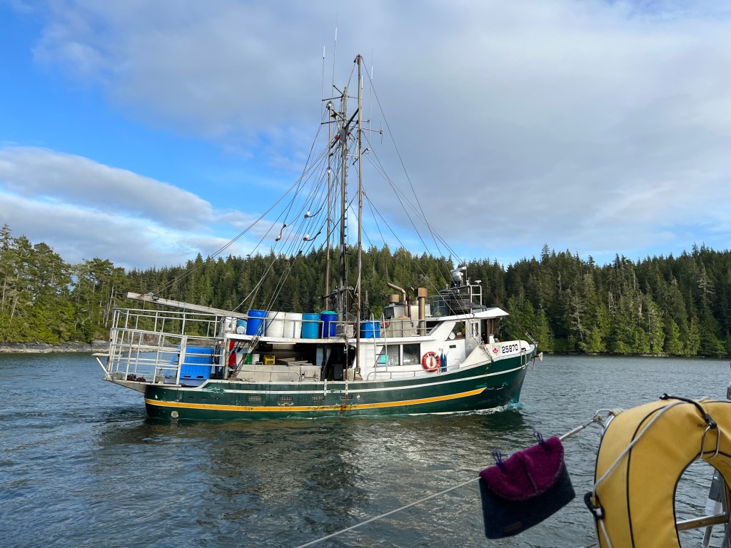 All of a sudden, our peace was intruded upon by a fishing boat that came right up to us in the bay, within maybe 50 feet initially. One of the crew yelled out that they didn’t believe the AIS information that we had a beam of 25 feet, and had to see for themselves. We’re a bit of a curiosity for sure, as you don’t see all that many sailing catamarans this far north.