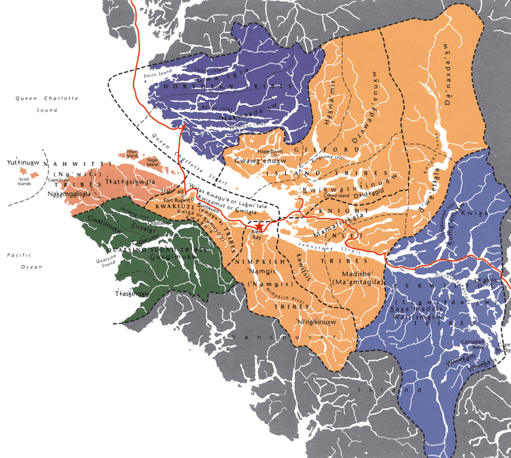 The Kwakwakaʼwakw are an ethnolinguistic group united by their common language (Kwak’wala) but comprised of eighteen politically-distinct nations. One such nation is the ʼNamgis nation, which holds claim to Alert Bay and the surrounding region.