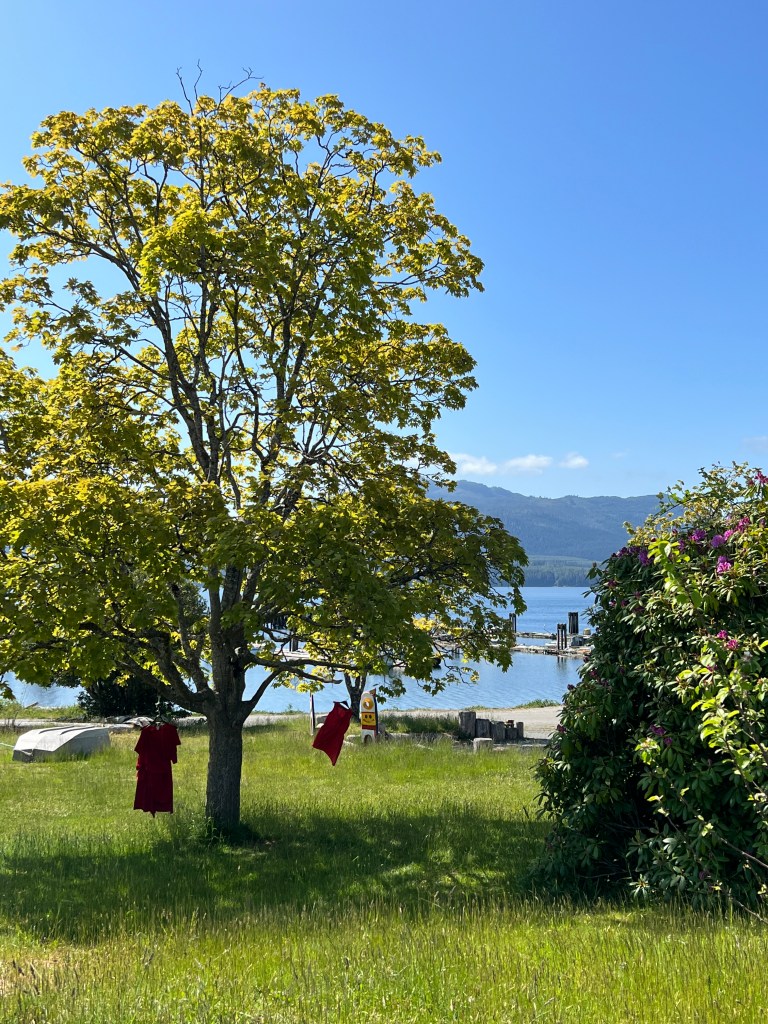 The second memorial we saw in Alert Bay was a sign reading “No More Stolen Sisters.” In the tree next to the sign hung two red dresses.