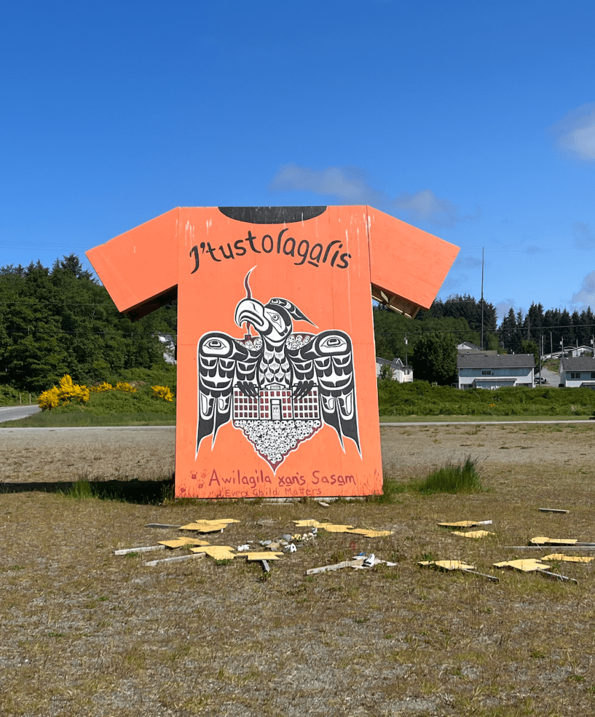 The memorial reads “I’tusltolagalis / Awilagila xan’s Sasam” meaning “rising up together / every child matters.” The orange T-shirt is the symbol of the National Day for Truth and Reconciliation (also known as Orange Shirt Day), which calls us to remember the suffering of residential school students.