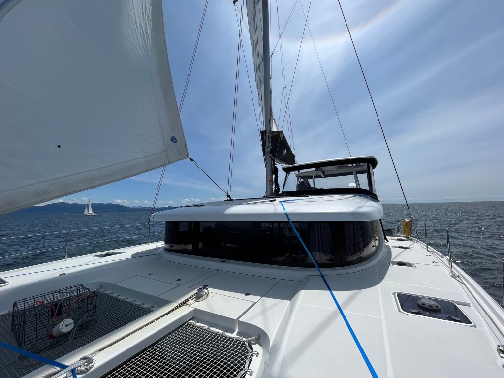 Winds were reasonably favorable for a reach across the strait, but with a fair amount of chop on the surface and since I was actively in work meetings we held off on putting up the sails.