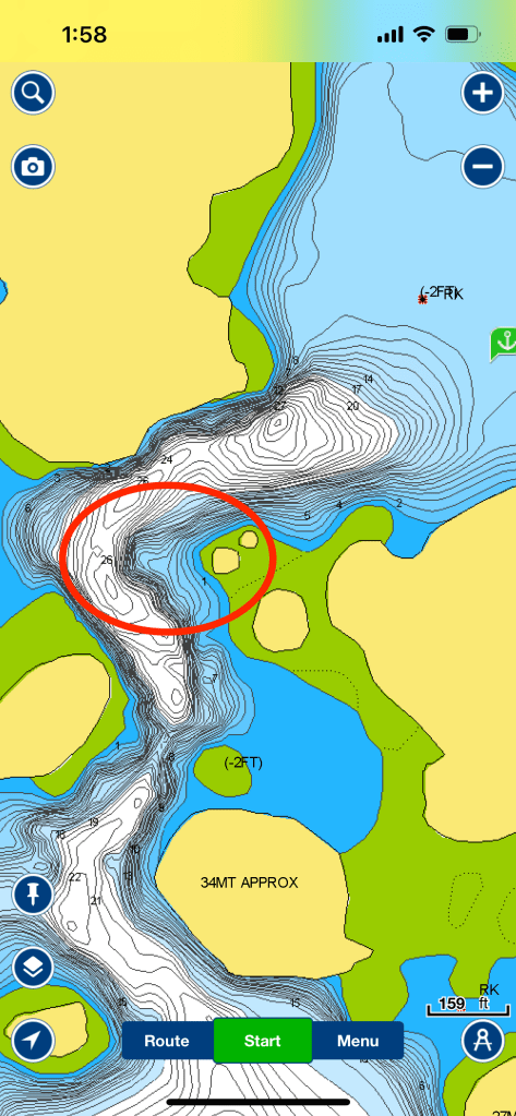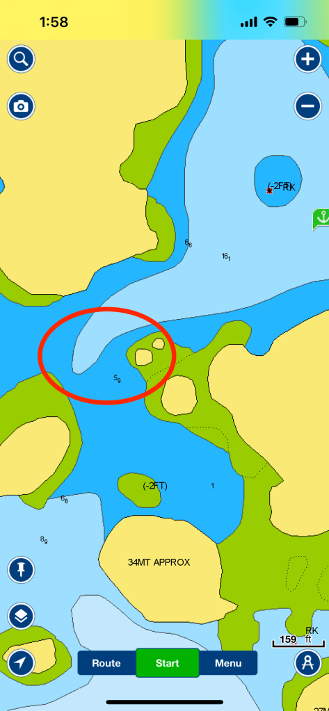 As we made the last turn into the anchorage, Grace called out from the starboard bow that we were very close to rocks she could see under the surface. I pulled us to port and gave the rocks a wide berth. I later pulled up the Navionics application and looked at the SonarChart view of the entrance to the Labyrinth. Sure enough, there is a ridge of shallows that extends out where Grace saw the danger. I’m now a convert and refer to the SonarChart data more often than not as the detail is much finer than the base nautical charts provide. Needless to say, we used the SonarChart to follow the narrow channel back out of the anchorage and had no issues.