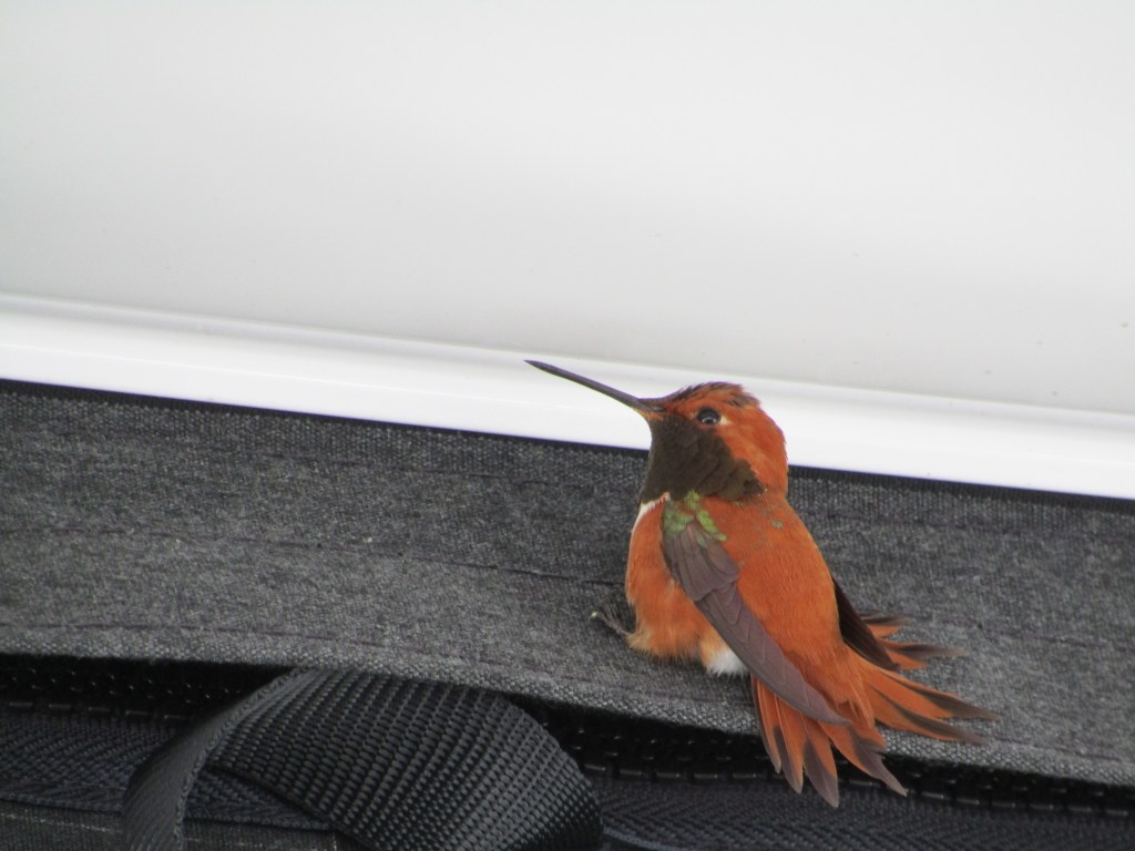 When we were in Allison Harbor the day before we had noted a hummingbird flying nearby. I didn’t see the bird, but heard its distinctive whistling flight as it went by. Here in the Labyrinth, we were surprised to find a hummingbird buzzing around inside our helm station. The enclosure was zipped up, and the little bird could not escape without going down into the cockpit. After a bit it settled down and clung to the edge of the enclosure. We were able to unzip the main door and eventually he flew out.
