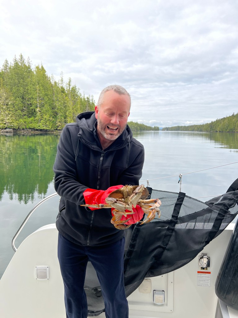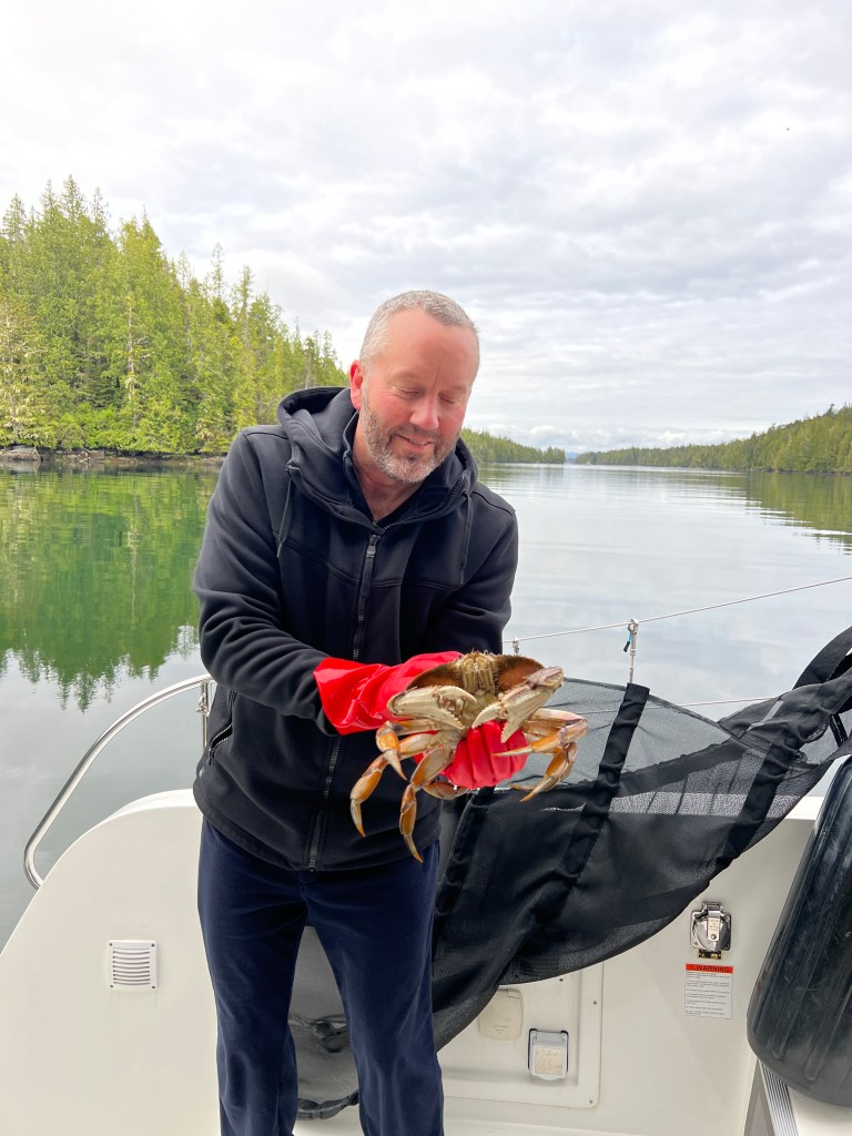 We had set a crab trap the night before, and let it soak in the bay. Melinda pulled it up to find a single large male Dungeness crab. Not enough to fill the pot for yet, so we put lonely Larry in a bucket of seawater in hopes we’d catch more that night.