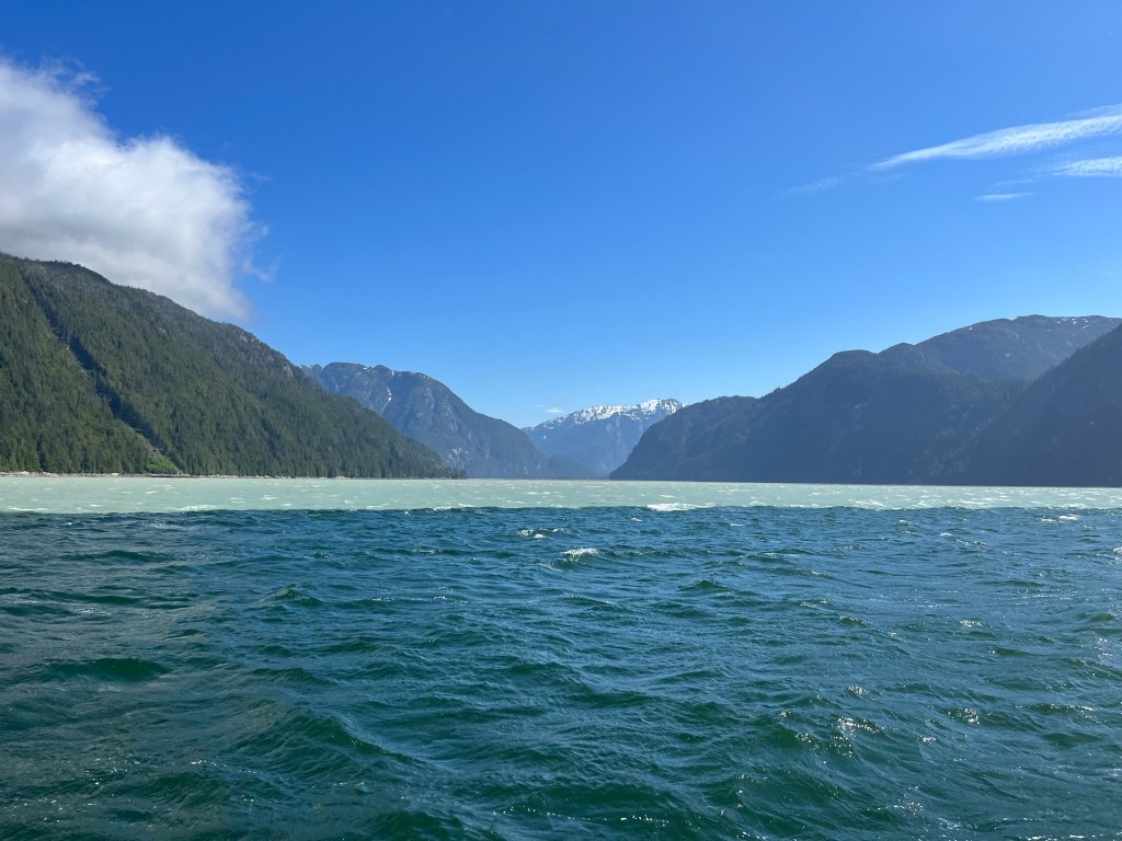 The current direction was clear as we passed the inlet where the Chickamin River flows into the Behm Canal. The outflow was light colored from the silt, and was moving northwards on the ebb. The distinct line in the water was striking.