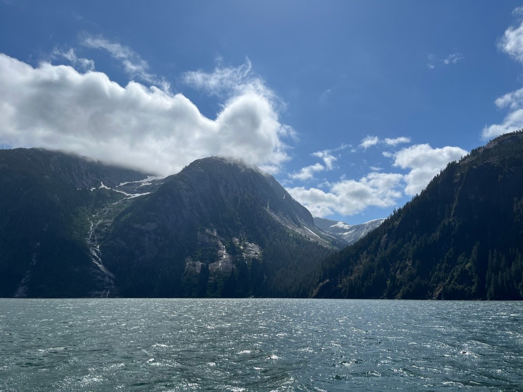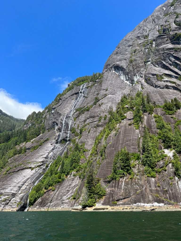 The tension reduced significantly as we turned into Walker Inlet, and had relief from the wind and current on our nose. Cruising up the fjord was magical. Many of the massive granite cliffs had waterfalls streaming down like pieces of white yarn. The sheer cliffs plunged directly to the water into depths of 500-900 feet below the surface.