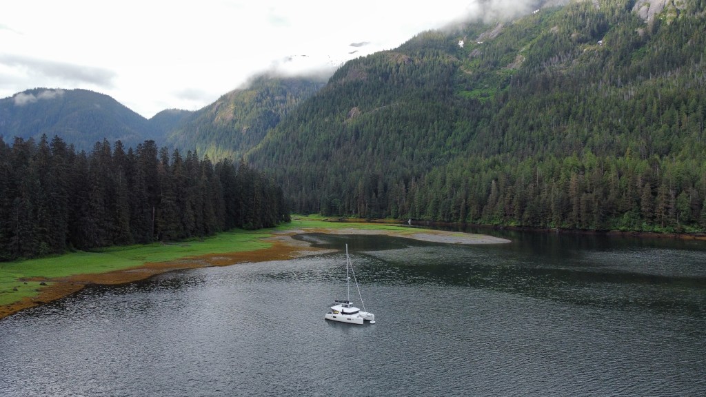 Wrong on both counts! As soon as we turned back out into Behm Canal we were hit with 20-25 knot winds ripping up the channel. The wind tunnel effect strikes again. I also clearly didn’t understand how the current flows in the Behm Canal, and we found a strong current flowing northwards against us during the ebb. All in all, it made for a miserable slog beating up the channel under motor, running slow to avoid pounding.