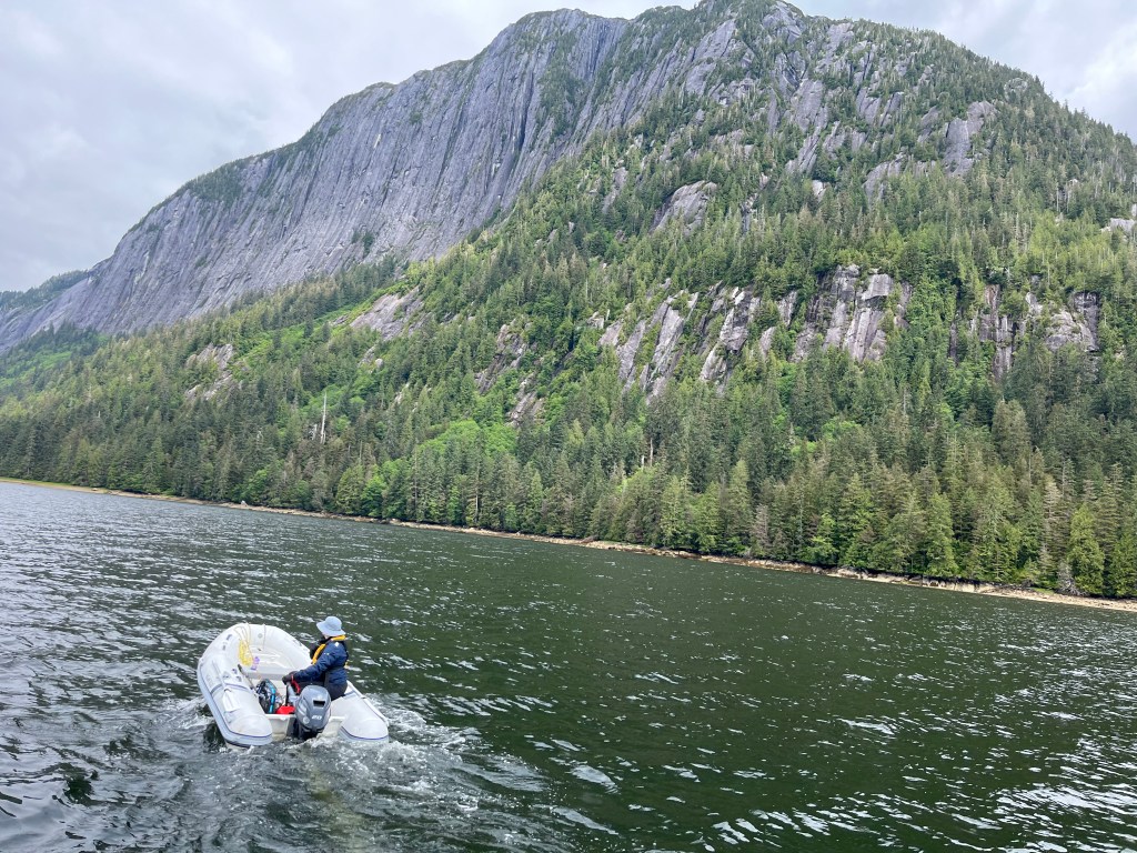 Before long we noted that there was a dinghy ashore. A couple from our neighbor boat were soon aboard and paying us a visit. They pointed out a grizzly on the shore nearby that had just emerged from the trees, apparently a daily visitor. The couple had been looking for the trail to Punchbowl Lake, a presumably short hike with a steep climb to the lake perched above the cove. As they had found more bear signs than trail, they decided to give up and move on to their next anchorage.