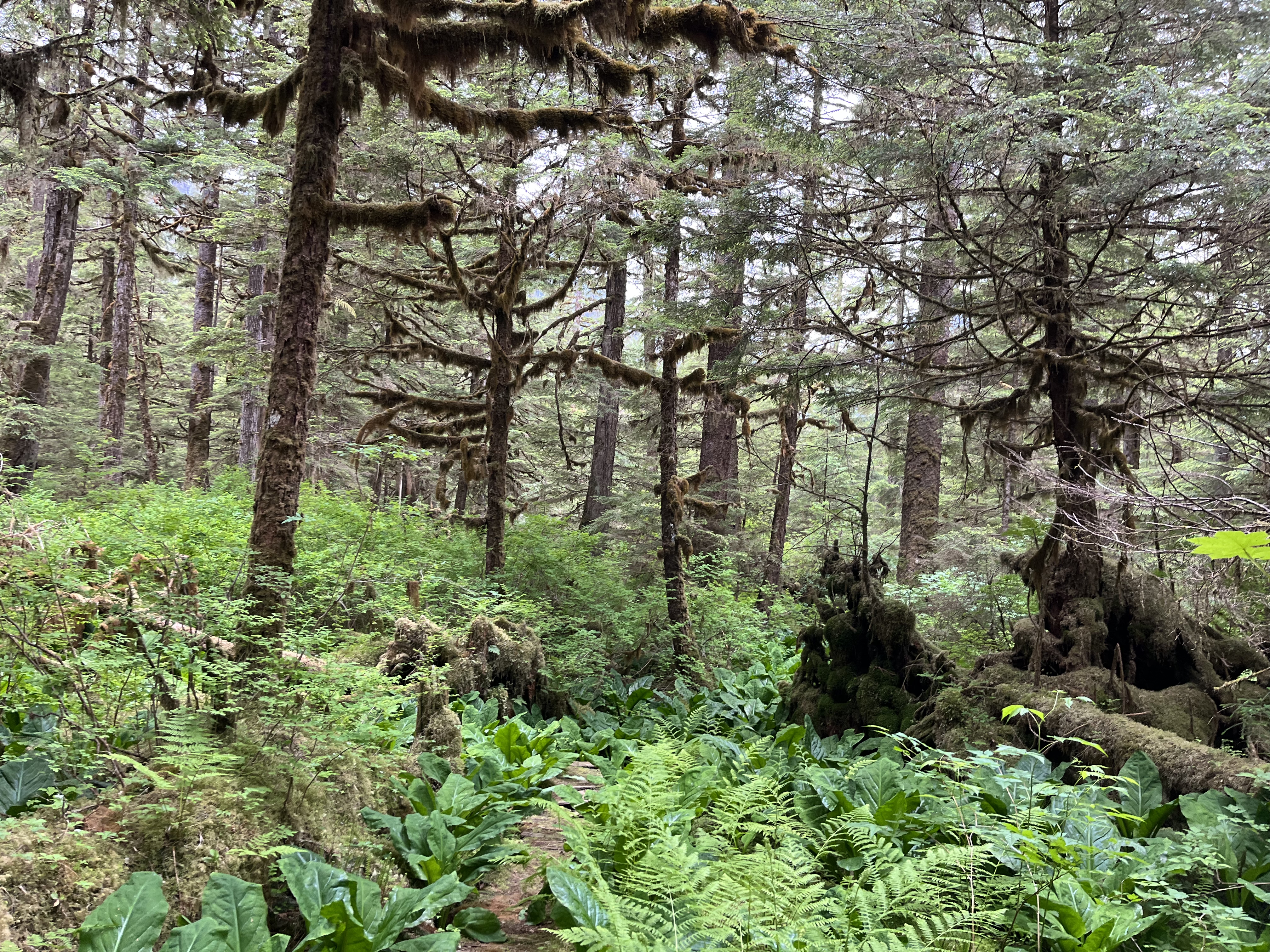 Grace and I located the trailhead without much trouble, but also saw the paw prints and scat piles left by bear or bears. As we figured the resident bear was up on the other side of the cove, we proceeded with caution. We were equipped with our bear spray, the air horn from the boat, and an annoying proclivity for singing obnoxiously (mostly me) in a loud voice. Our intent was to alert any bear in our path to our presence well before it became a surprise.