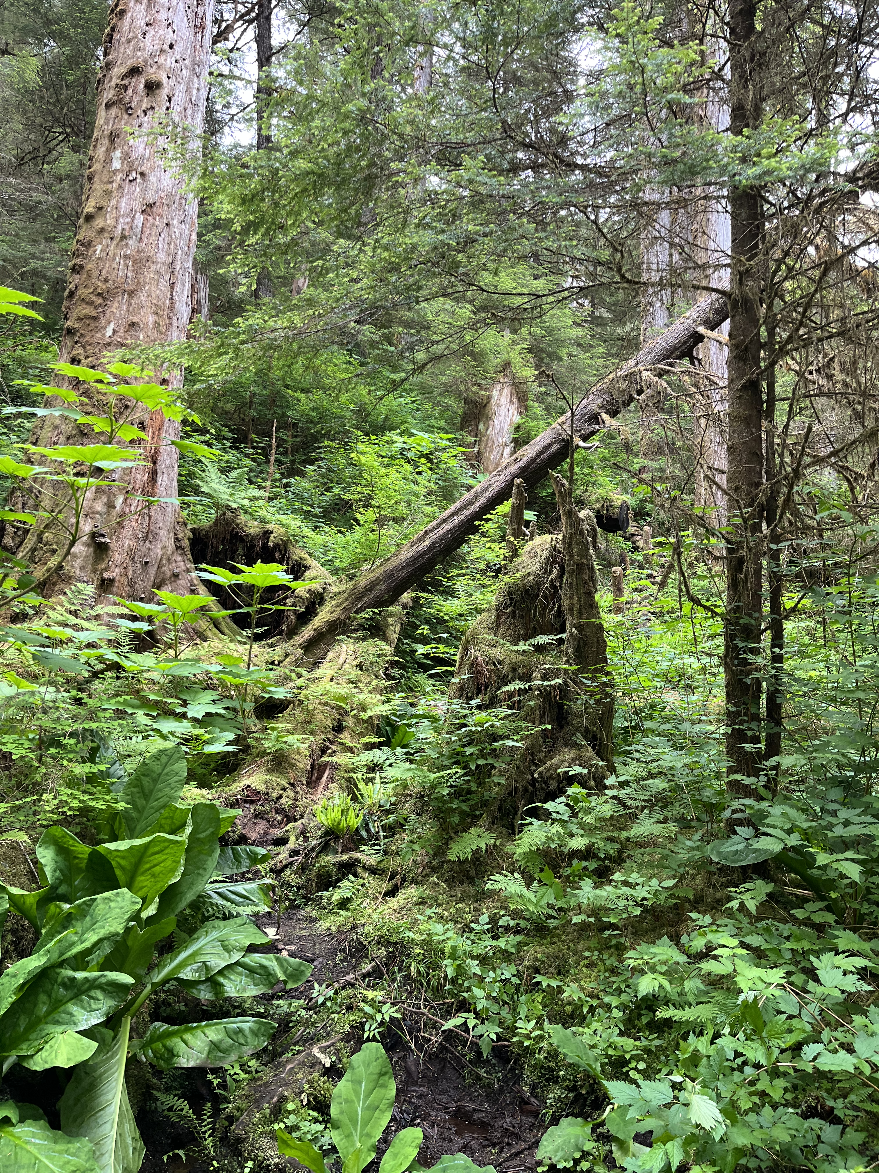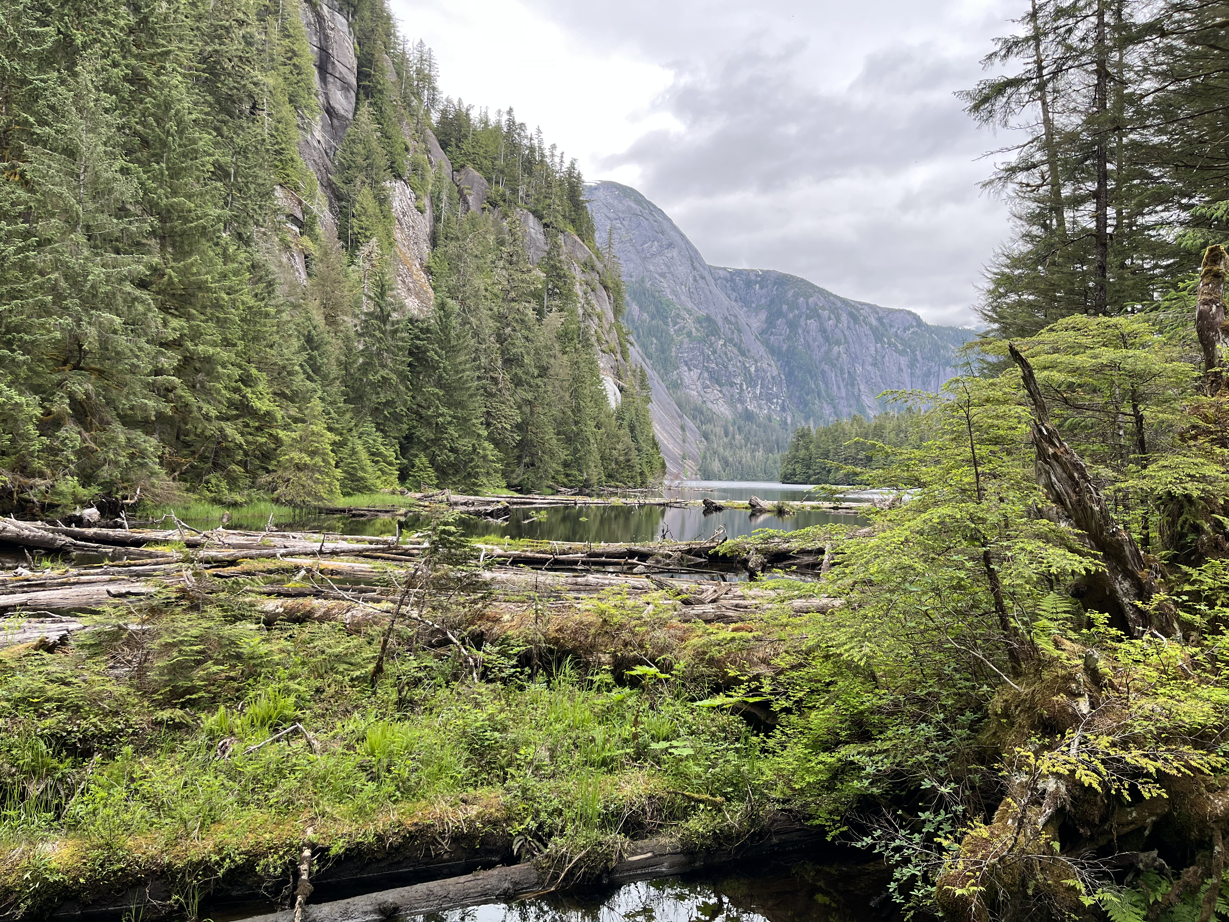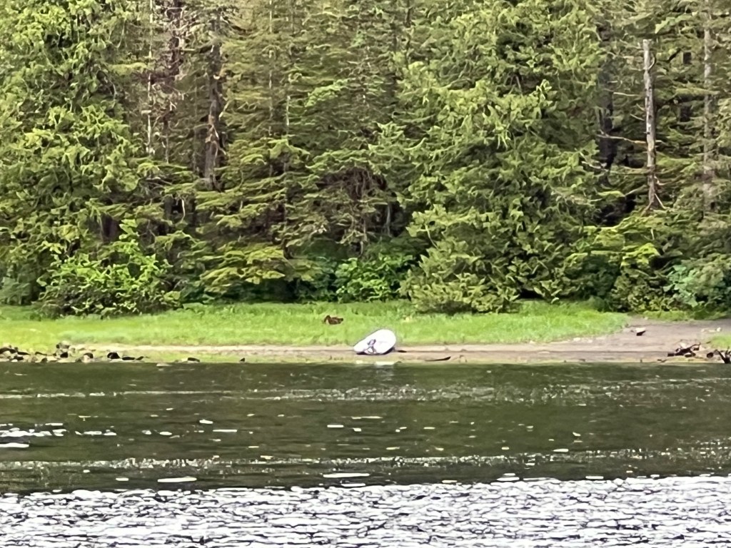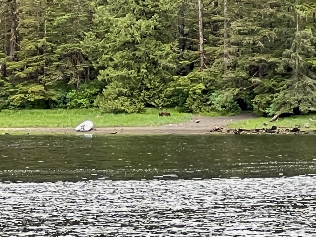 Grace and I redoubled our efforts to make noise as we descended the rest of the way down the trail, getting our air horn out to sound the occasional blast in time with “Oh a Hunting We Will Go.” Melinda let us know by VHF that our efforts were in vain, and the bear had moved even closer to the trailhead where we would emerge onto the shore.