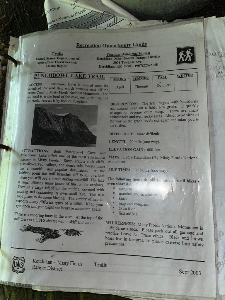 The log book also humorously contained more information about the trail than I’d been able to find online. Given our extreme fatigue after reaching the lake, we both sneered with sarcasm at the title “recreational opportunity guide”.