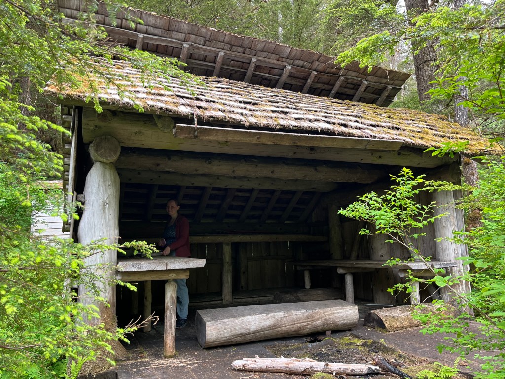 Eventually we found the lake house, which was a three-sided structure that was fairly well intact. It had not yet returned to the forest as much of the trail had. Inside was a deteriorating log book, so Grace put us down as “highly recommends” – actually writing “we survived”.