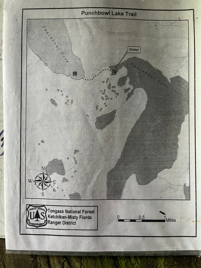 We finally emerged into open air again as Punchbowl Lake opened before us. We decided we really must find the boat house that was described in the park documentation. We trudged on along the lake shore, with the trail sinking into muddy soup every so often. Grace submerged a foot more than once, with the black mire sucking off her shoe before she could extract her appendage.