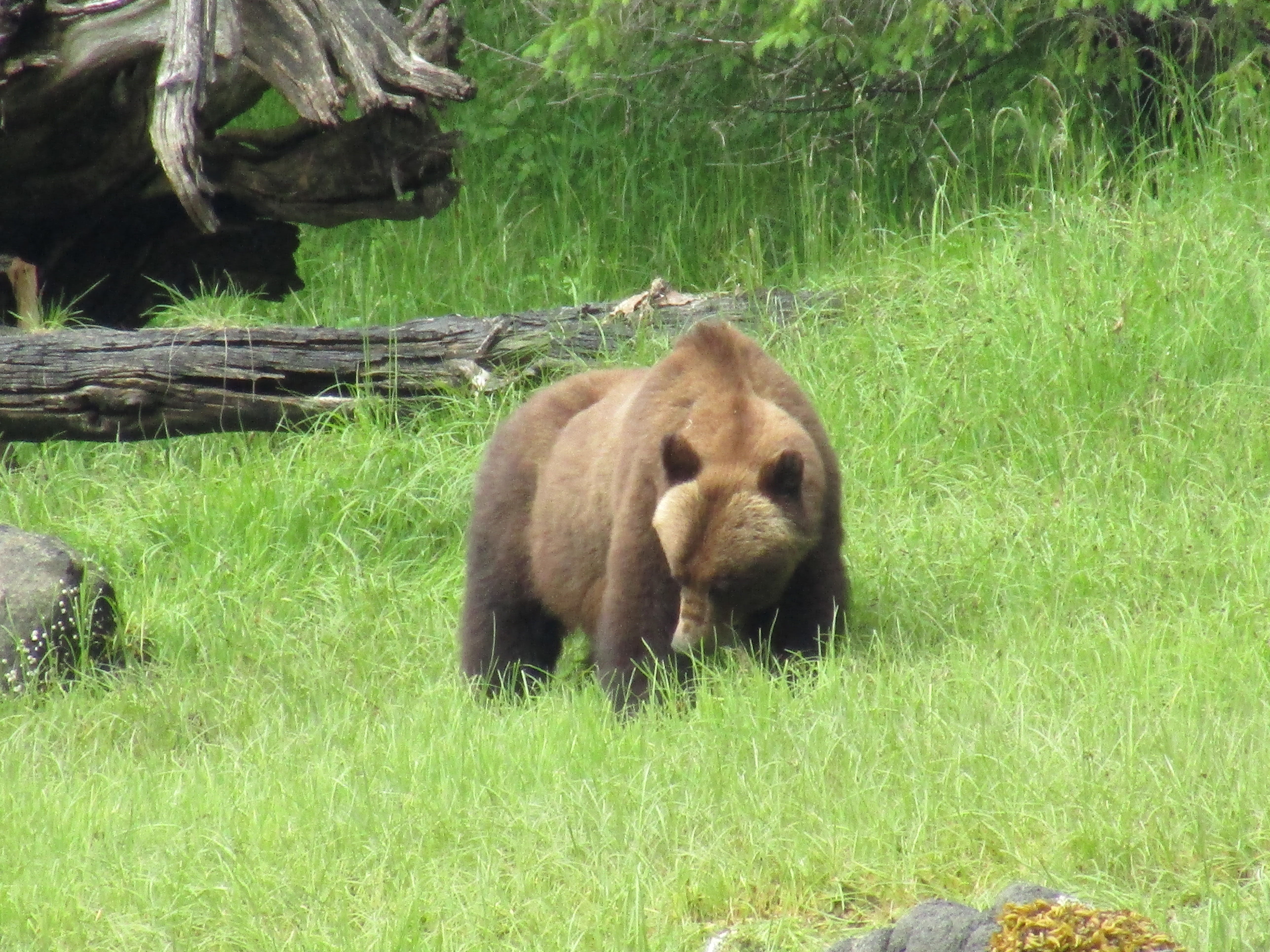 We’d brought along our handheld VFH to check in with Melinda, and called her once we had eyes on the cove from above. We were startled to learn that Mr. Bear from earlier in the day had made his way to the dinghy, and was now munching away on the sedge grass nearby.