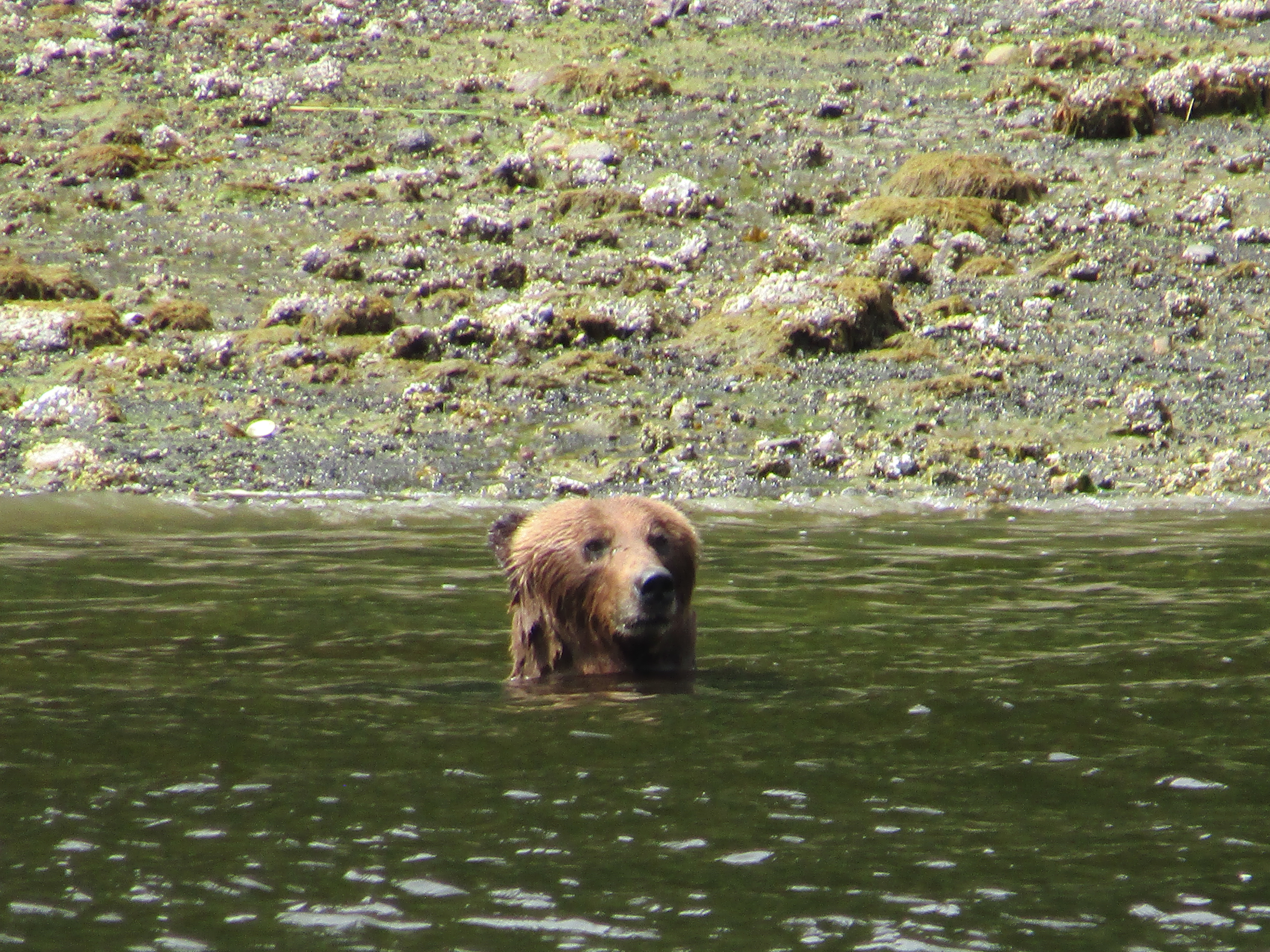 We took a number of pictures and videos of the resident grizzly. We were a bit startled at his move into the water, but it appeared he only had interest in the shallows. His apparent bulk was greatly reduced by his bath, though even when wet his size was formidable.