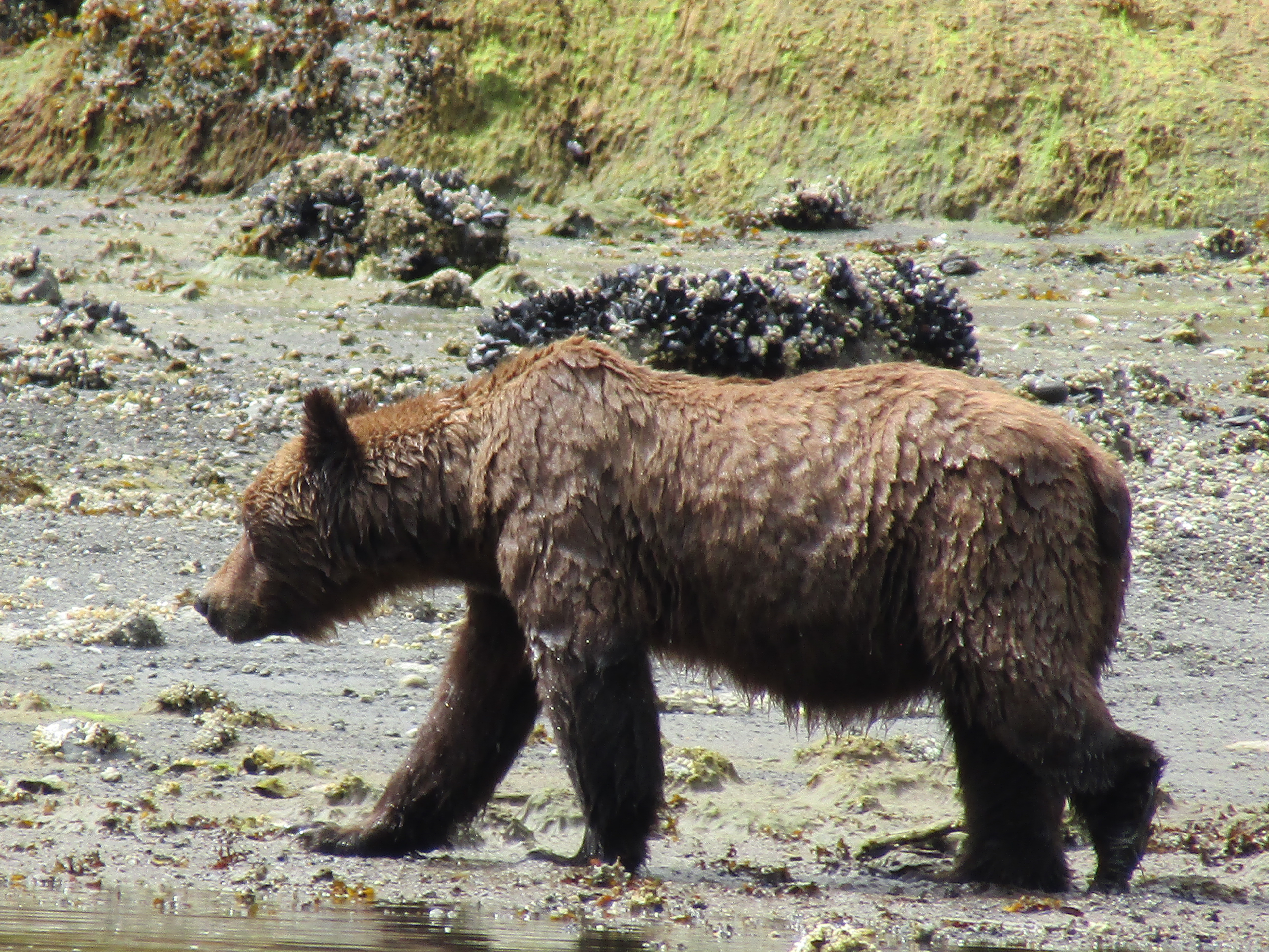 Our final challenge was to get the dinghy back into the water. As we’d been away for almost three hours, the receding tide had left Ghost high and dry. With our bone-weary bodies, we hauled the 500 pound launch down the sandy beach to the water. Our remaining energy was coaxed to the surface imagining Mr. Bear watching us hungrily from the eaves of the forest.
