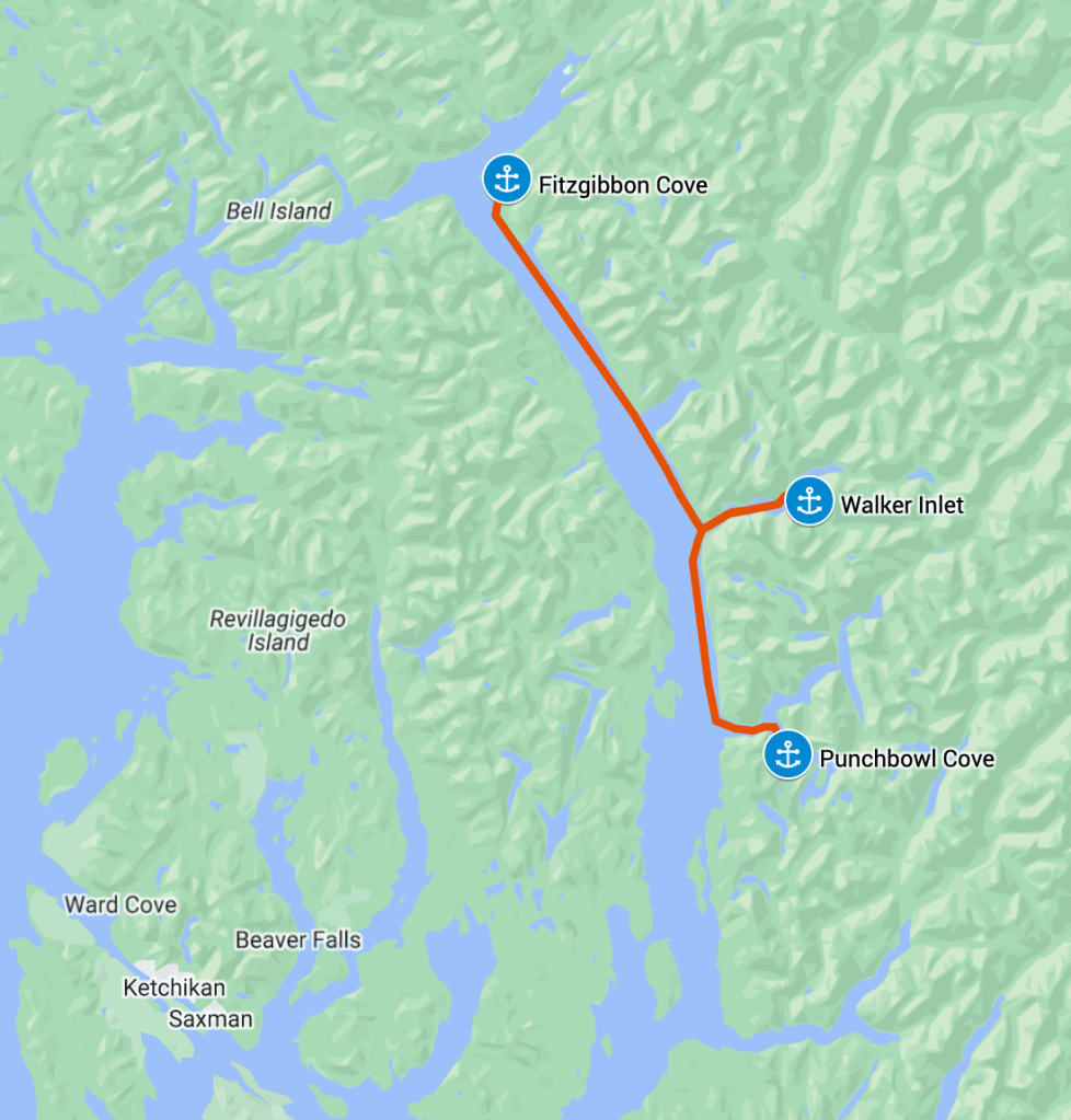 After a pleasant evening in Fitzgibbon Cove we were ready to move into the more majestic sections of the Misty Fjords. The weather forecast promised settled weather and I thought we’d be cruising out on an ebbing current southward. Should be an easy, fast run down to Walker Inlet.
