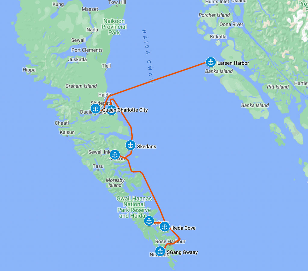 Perception’s route across to Haida Gwaii and south to S’Gang Gwaii and Bag Harbor