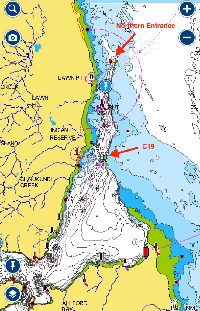 We took the most conservative route into Skidegate Inlet, entering the entrance channel near the north end of the bar. I’d had some concern that there might possibly be breaking waves or at least significantly increased swell in the shallows of the bar, and wanted to avoid that. We saw no evidence of this the four times we crossed the bar in and out of Skidegate Inlet, though the wave state was never much worse than 1 meter when we did.