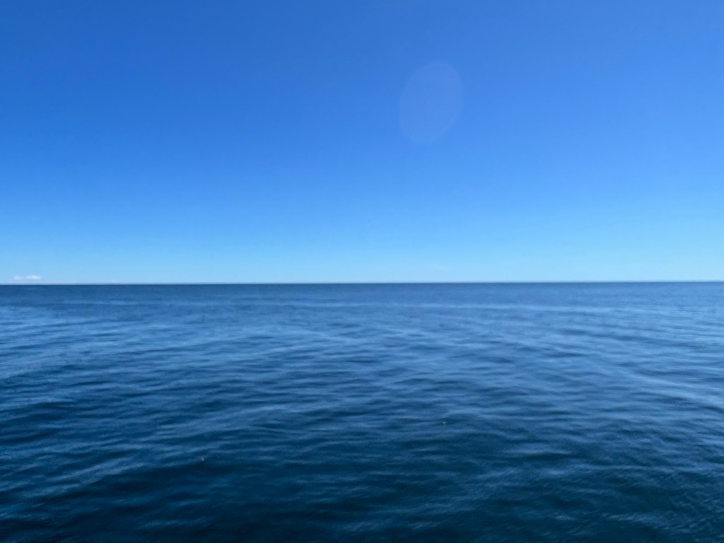 We did indeed pick a nice day, and other than being a long crossing it was quite pleasant being out on the water. There was very little swell, and the light wind state meant almost no wind waves building on the surface. As with most of our trip we motored the whole way across in very light air.