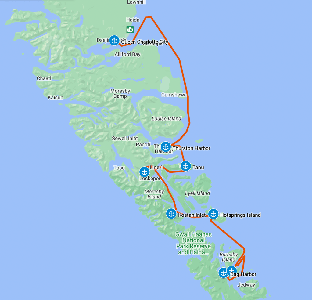 It was starting to look like Saturday would be a decent day for getting back across Hecate Strait, and I would be free to pilot us across. That Friday morning we headed back out around Cumshewa Head on Moresby Island and north to Skidegate Inlet to stage ourselves for the crossing.