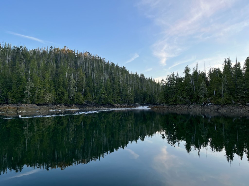 We arrived at the Bay of Plenty that evening, which is an arm off of the Laredo Inlet. We were in Spirit Bear country, and we hoped to see one of these white-colored bears as we passed through. The Bay of Plenty had a large drying area that we hoped might be a place to see bears, as we’d seen them eating sedge grass in these areas in Haida Gwaii.