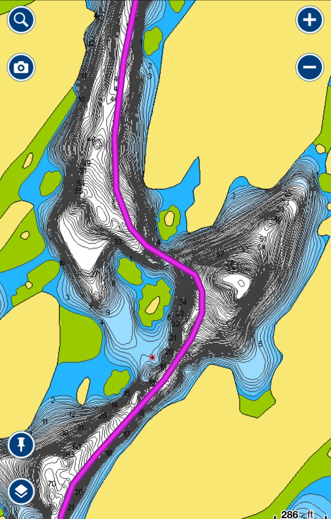 It was quite narrow, but without much current was no real trouble to pilot through. As usual, we posted Melinda and Grace on the bows to watch for any uncharted obstructions, but found that our Navionics charts matched reality enough to get us through.