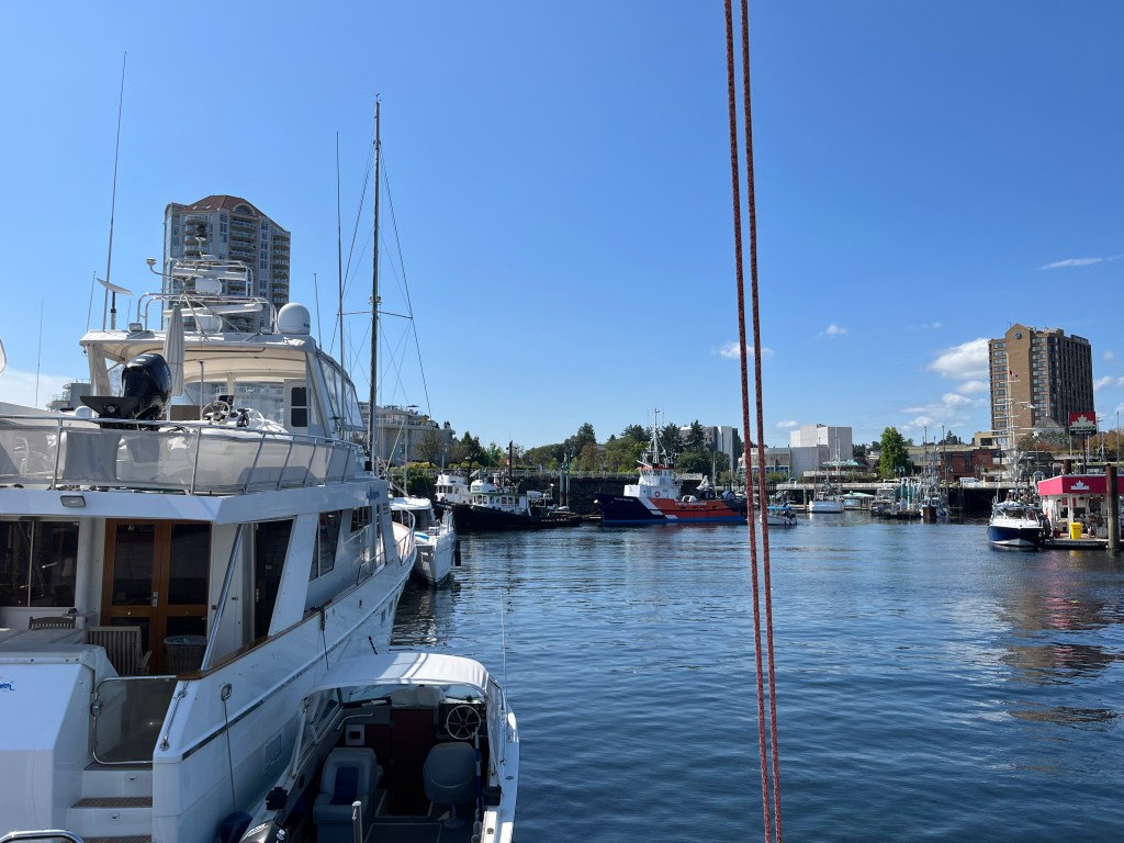 We made it in to Victoria mostly on an ebb tide, making good time until we turned into the Strait of Juan de Fuca. There we fought back-eddies and the start of the flood to get the last few miles in to the harbor. Victoria is old-hat for us at this point, and we are very familiar with the harbor entrance rules. We were somewhat amused to see a couple different boats get chased down by the harbor patrol for speeding in the 7-knot zone. One rarely sees an auto get pulled over for speeding, let alone a boat!