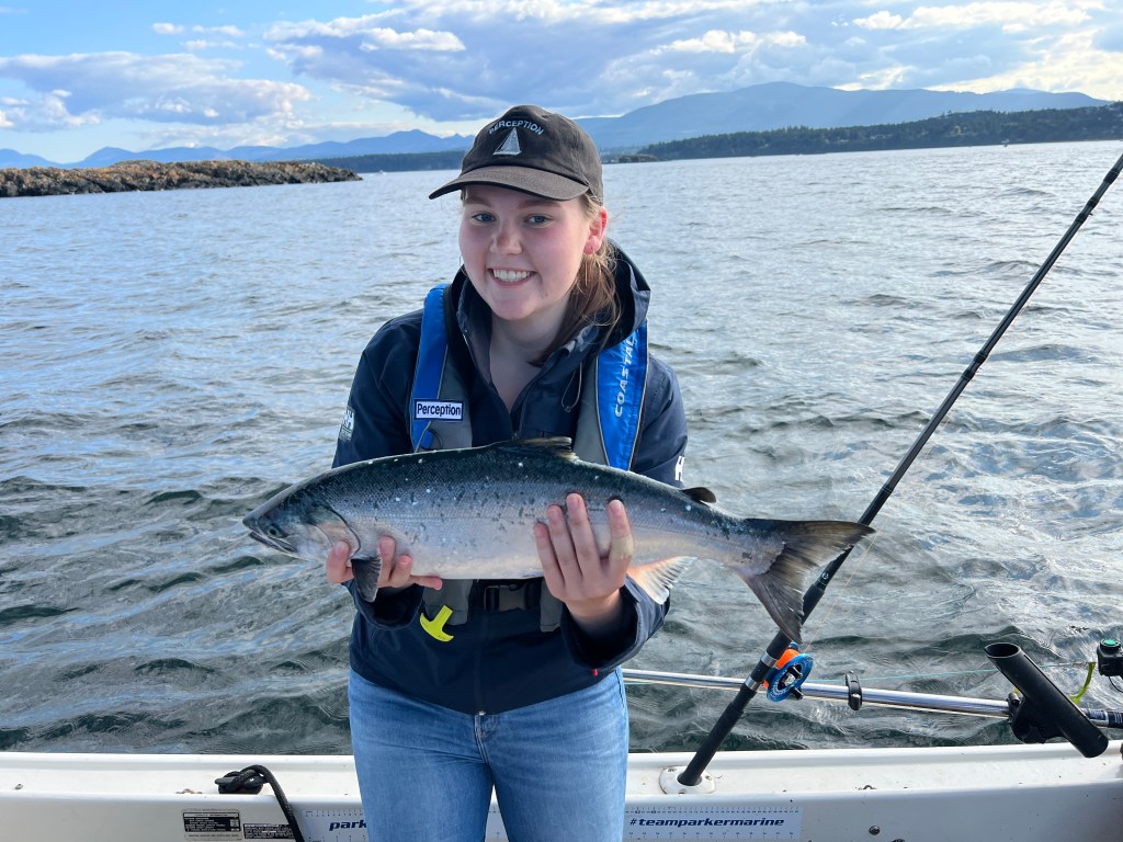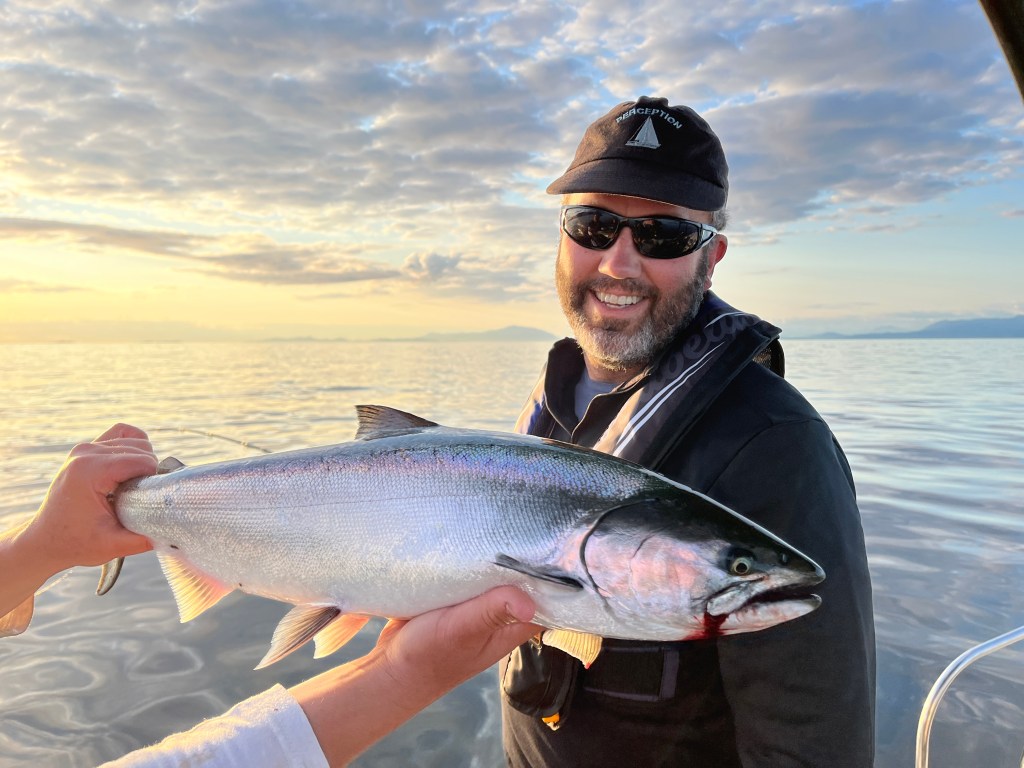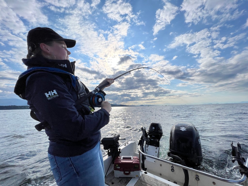 Later that afternoon we went on a chartered fishing trip. We’d been attempting to catch a salmon for some time, but other than briefly hooking one at the surface we’d had no luck. Our charter captain took us out in a Boston Whaler which resembled a surfboard with a gigantic motor strapped to the back. We rapidly planed out to the fishing grounds around Snake Island and began slowly trolling through the area with 10 or so other boats.