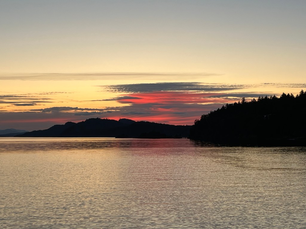 We went ashore in an attempt to avoid cooking dinner, but found that the Saturna Lighthouse Pub wasn’t serving dinner on Tuesdays, staff shortages and all. We settled for a drink, then settled back onto Perception for the evening.