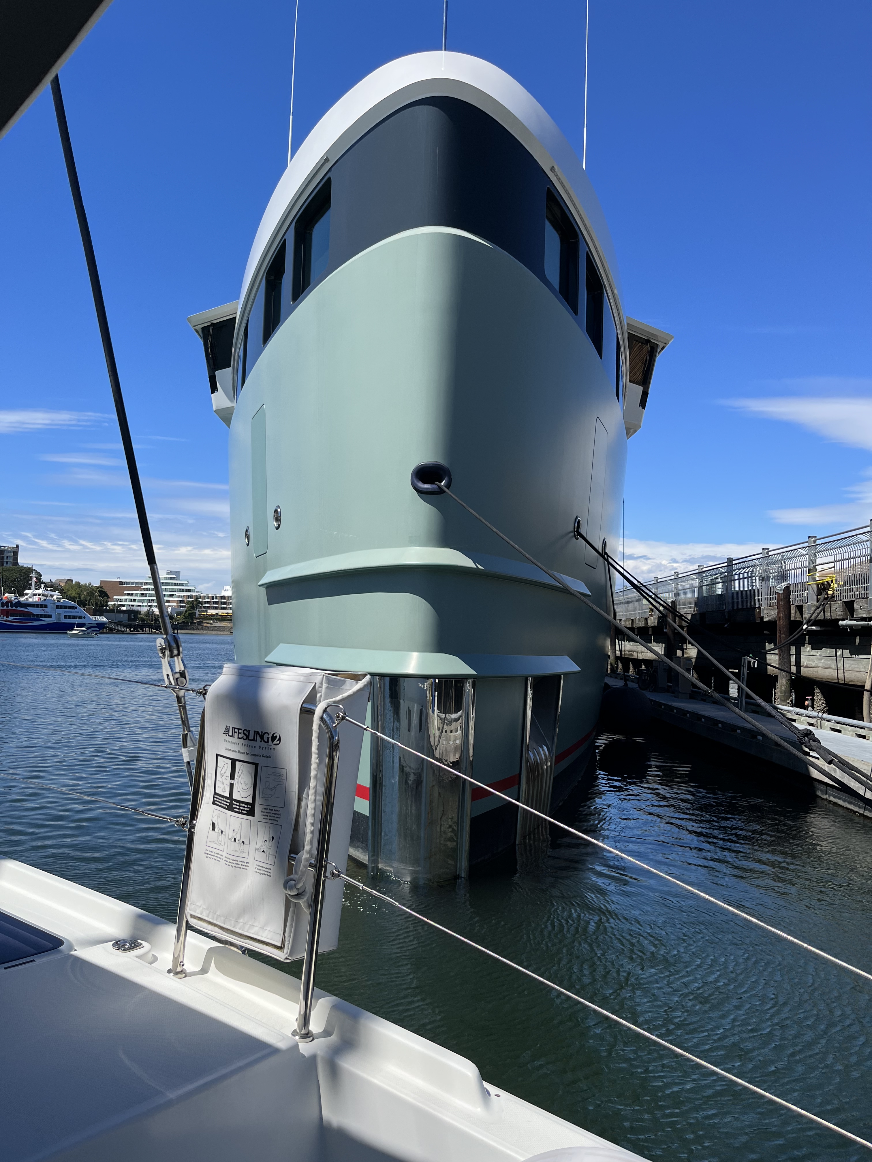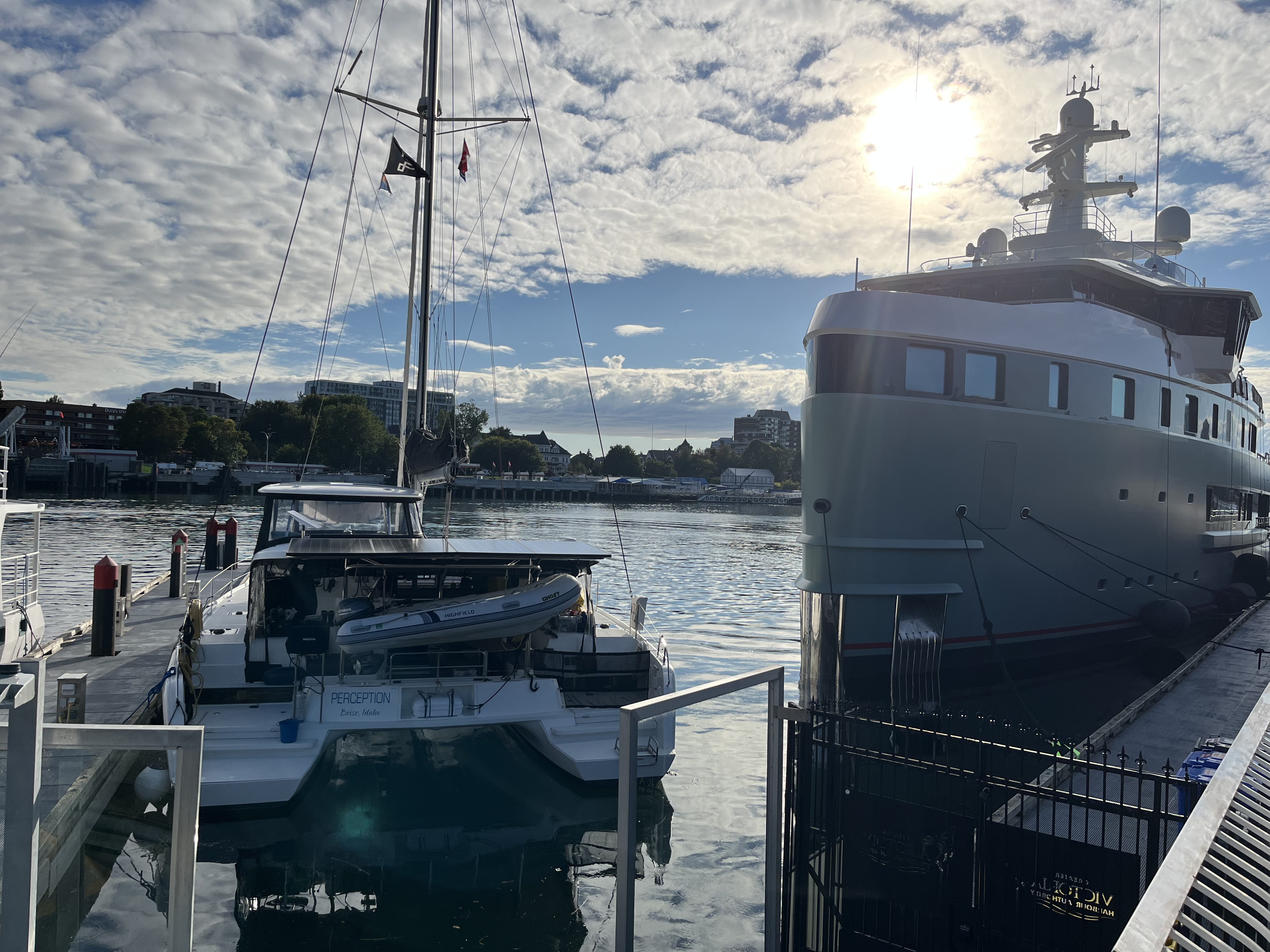 We were disappointed to learn from the harbor authority that we wouldn’t be able to take our normal (promised) spot on G-dock of Causeway, which is really the best view of the city. Strangely they had parked a number of monohulls there rather than reserving it for beamy boats like Perception. We were shunted to Ship Point instead, which would have been OK but for the superyacht docked next to and over top of us! The thing blotted out the sunset and our view to the west. I was a bit nervous even being around this monstrosity lest I incur the wrath of someone who might sue us into oblivion if we dinged their boat.