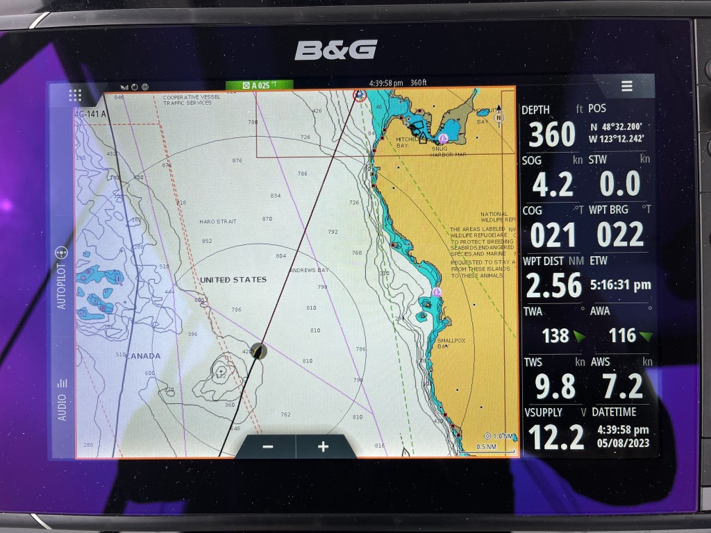Wednesday saw us heading south again in the Haro Strait. We dodged outside the shipping lane to avoid a large cargo ship near Turn Point, causing us to hold to the Canadian side of the border instead of cutting in through US waters. Foiled! It would be several more days before we would cross the border from Canada.