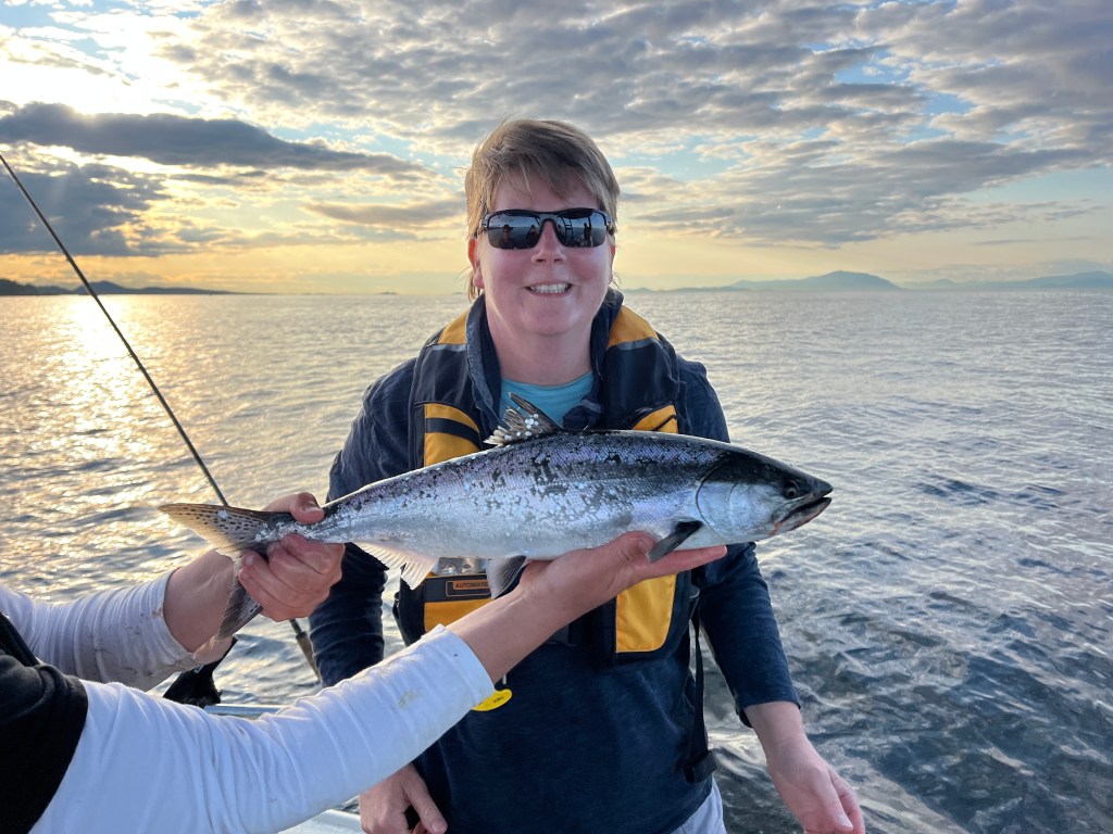 We were each able to hook and land at least one salmon. Unfortunately, every one was either under the minimum size limit, or in one case a wild coho which we were not allowed to keep. Nevertheless, it was fun and gratifying to pull the fish in, even if we were denied our salmon loaf for dinner!