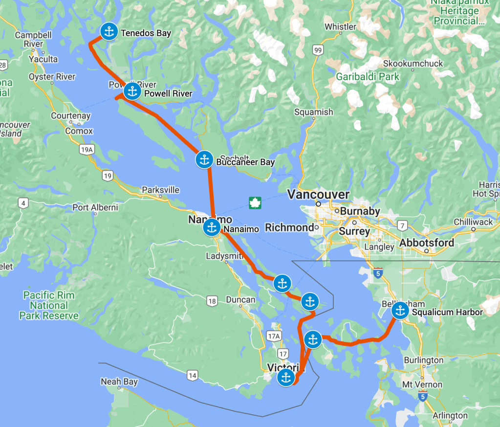 Saturday dawned and we headed across the Strait of Georgia to Nanaimo. We were now just a narrows transit away from our very familiar cruising grounds of the Gulf Islands.