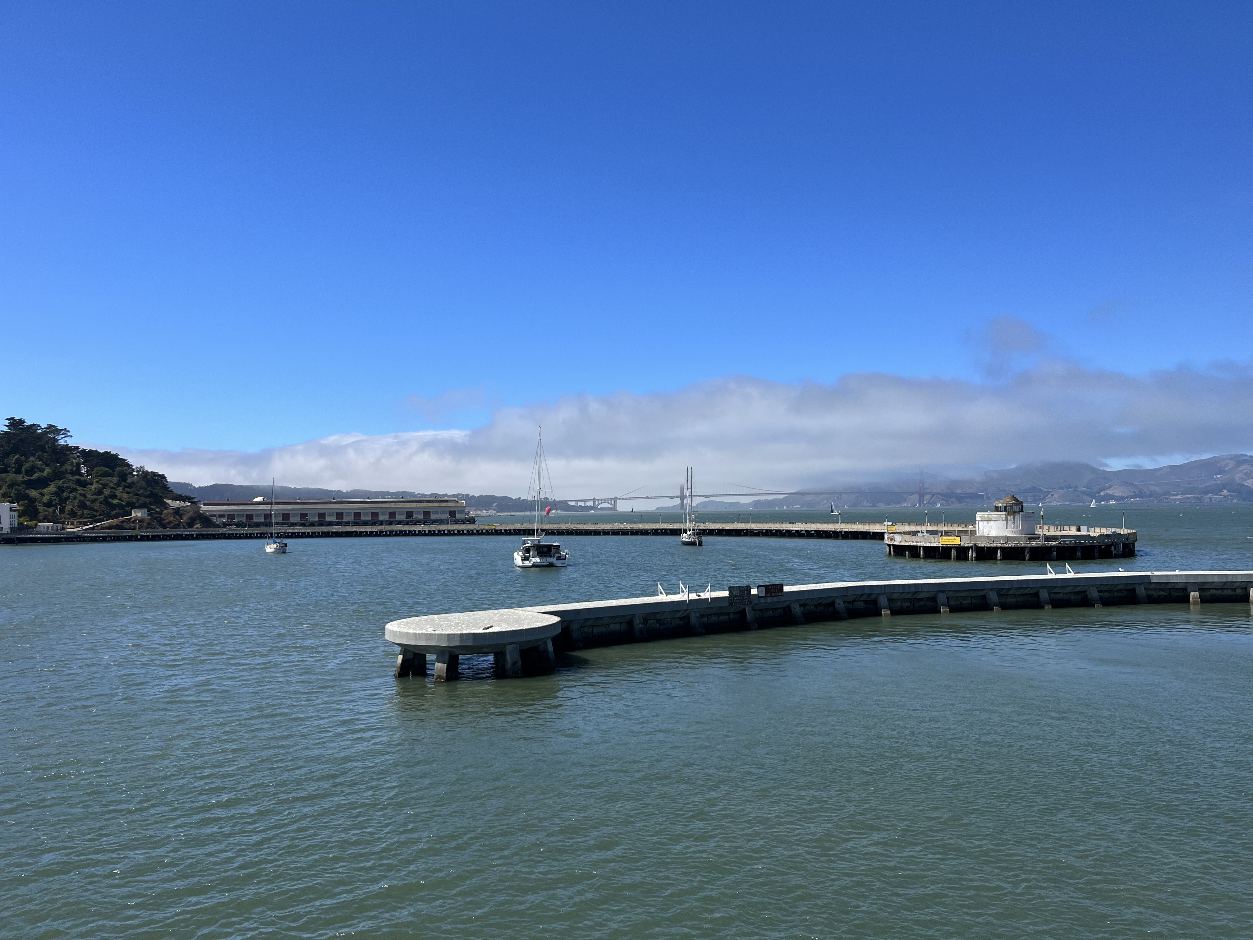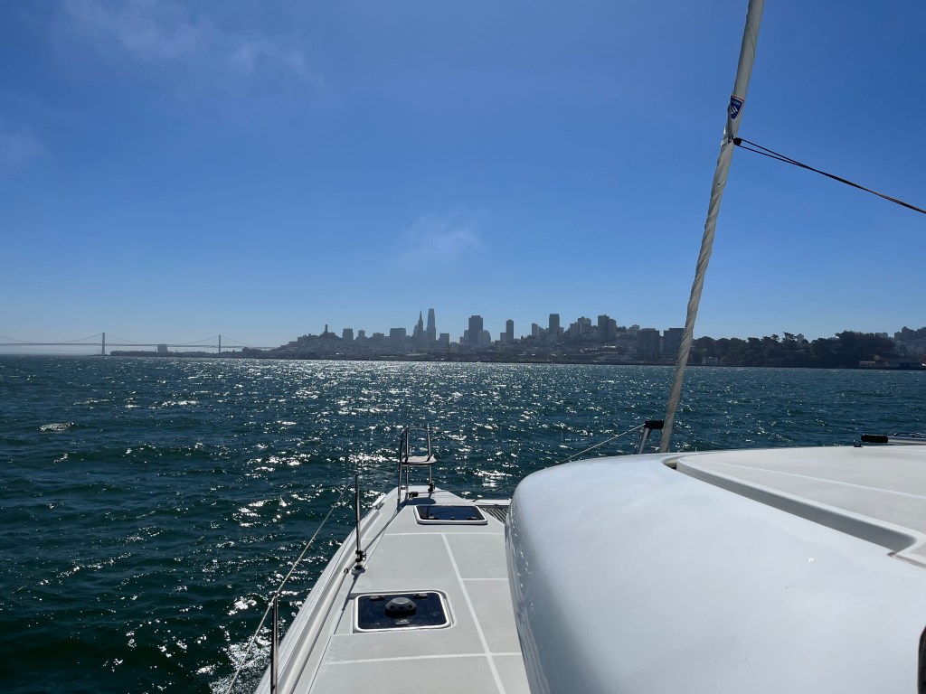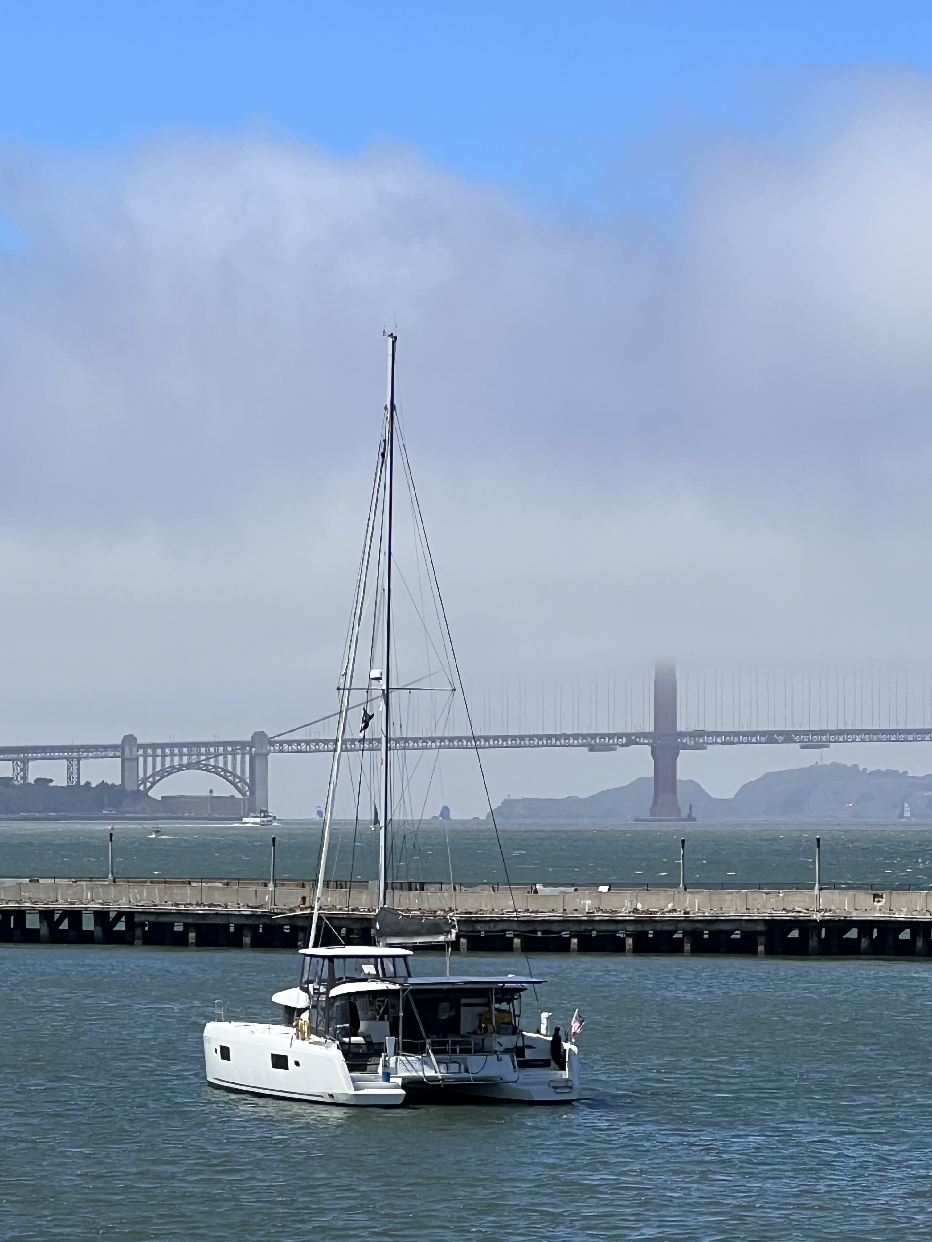 Friday dawned and we had a short window between my work meetings to fuel up and get ourselves across the bay to San Francisco. We fueled up at Clipper Yacht Harbor, squeezing in barely between the pilings and the fuel dock – I’m glad there was very little wind! The pilings were presumably there to protect the fuel dock, and as often occurs seemed spaced out to accommodate monohulls rather than catamarans.