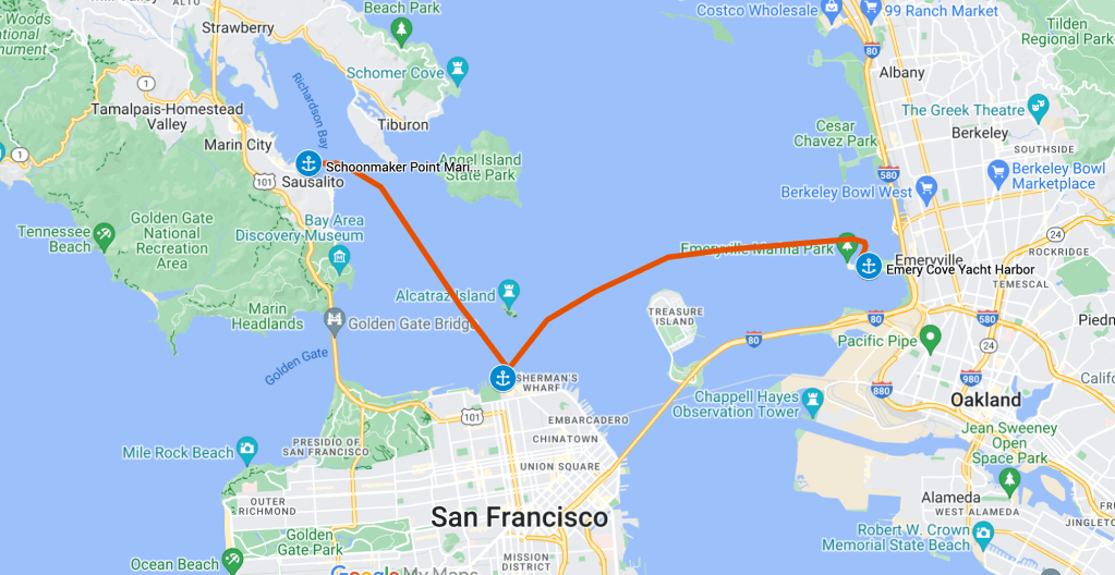 We’d thought about hitting Clipper Cove on Treasure Island and Ayala Cove on Angel Island before heading south, but found the comfort of Emery Cove to be too enticing to leave. We ended up staying there through Saturday when it was time again to take the next step down the coast.