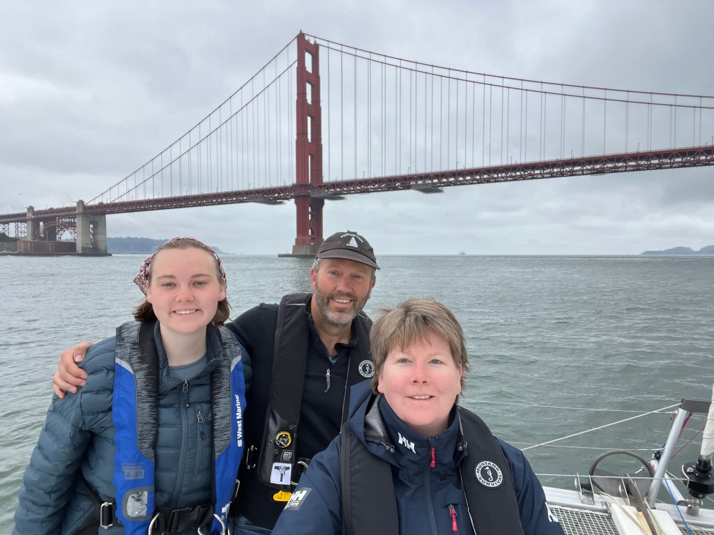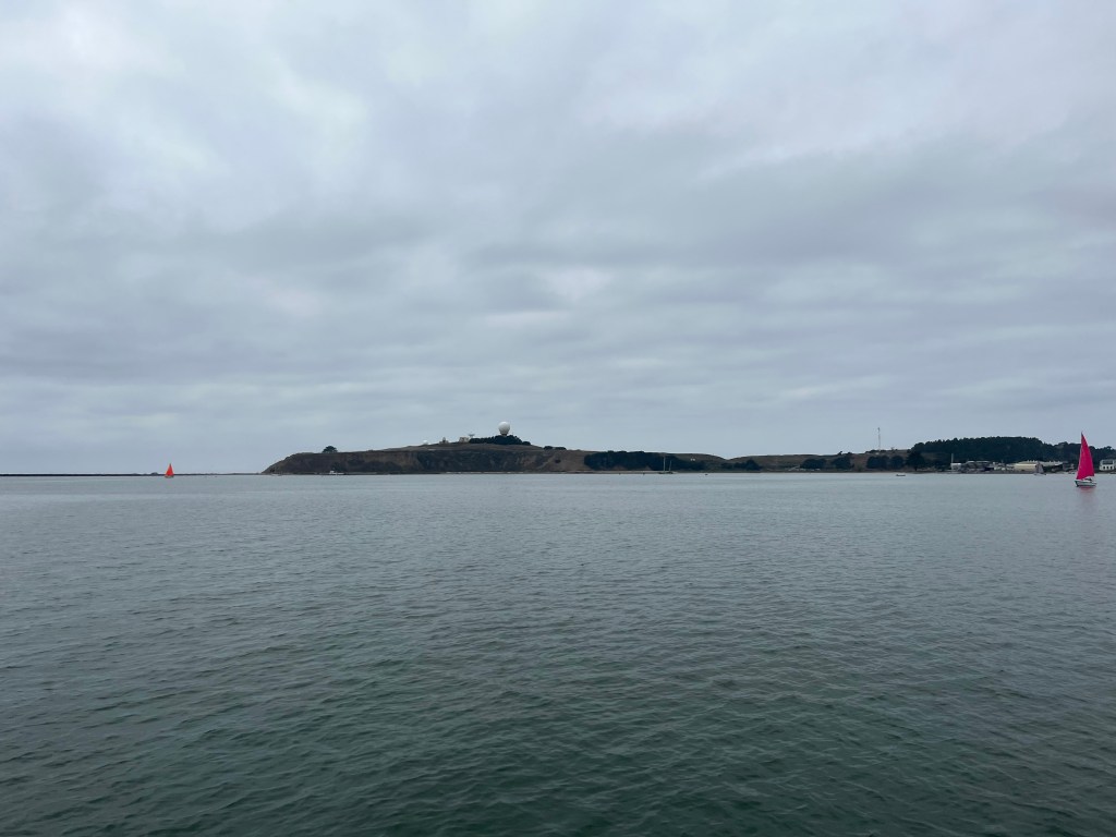 After nearly two weeks in San Francisco Bay, we were anxious to get moving south again. Saturday morning dawned with favorable weather to exit the Bay and head south. We motored across the bay and out under the Golden Gate Bridge. The weather was calm but overcast, giving us cool conditions but not enough wind to sail.