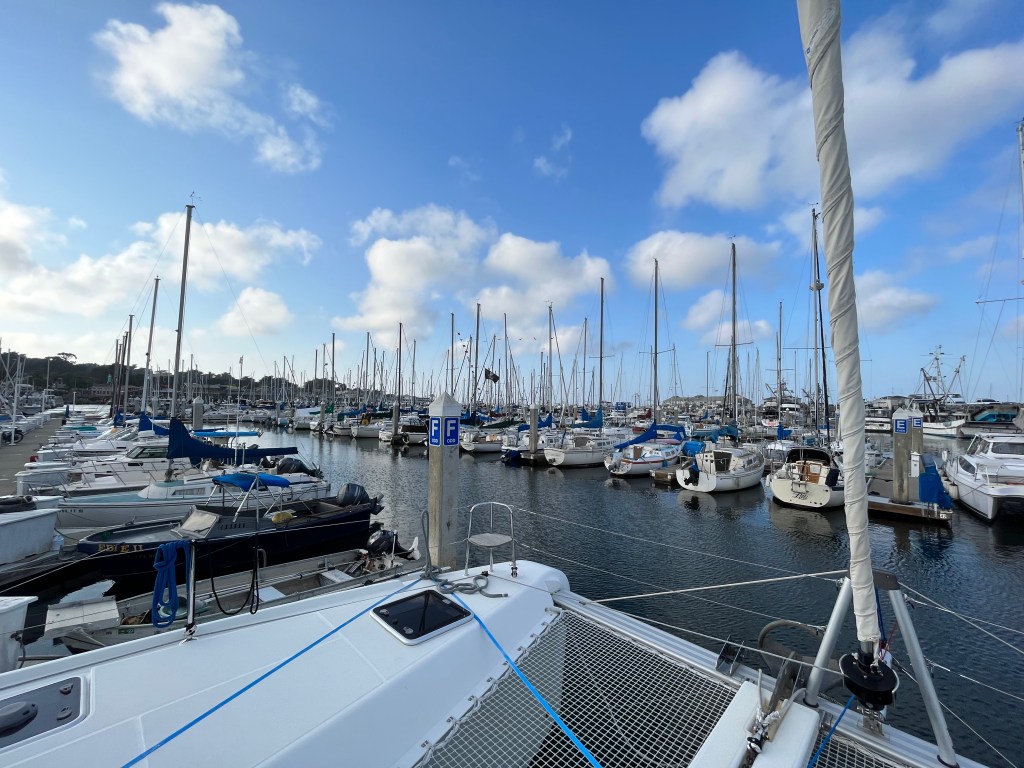 The other option was to get into the harbor with all the conveniences of being at a dock. The harbor didn’t take reservations, so we hoped something would remain open for us when we arrived. Luck was with us, and we were able to take an end tie along the main thoroughfare. Intentional or not, the Santa Cruz harbor has a very catamaran-friendly policy of keeping most of the end ties open for transient boats, which is typically the only place that a catamaran can fit.