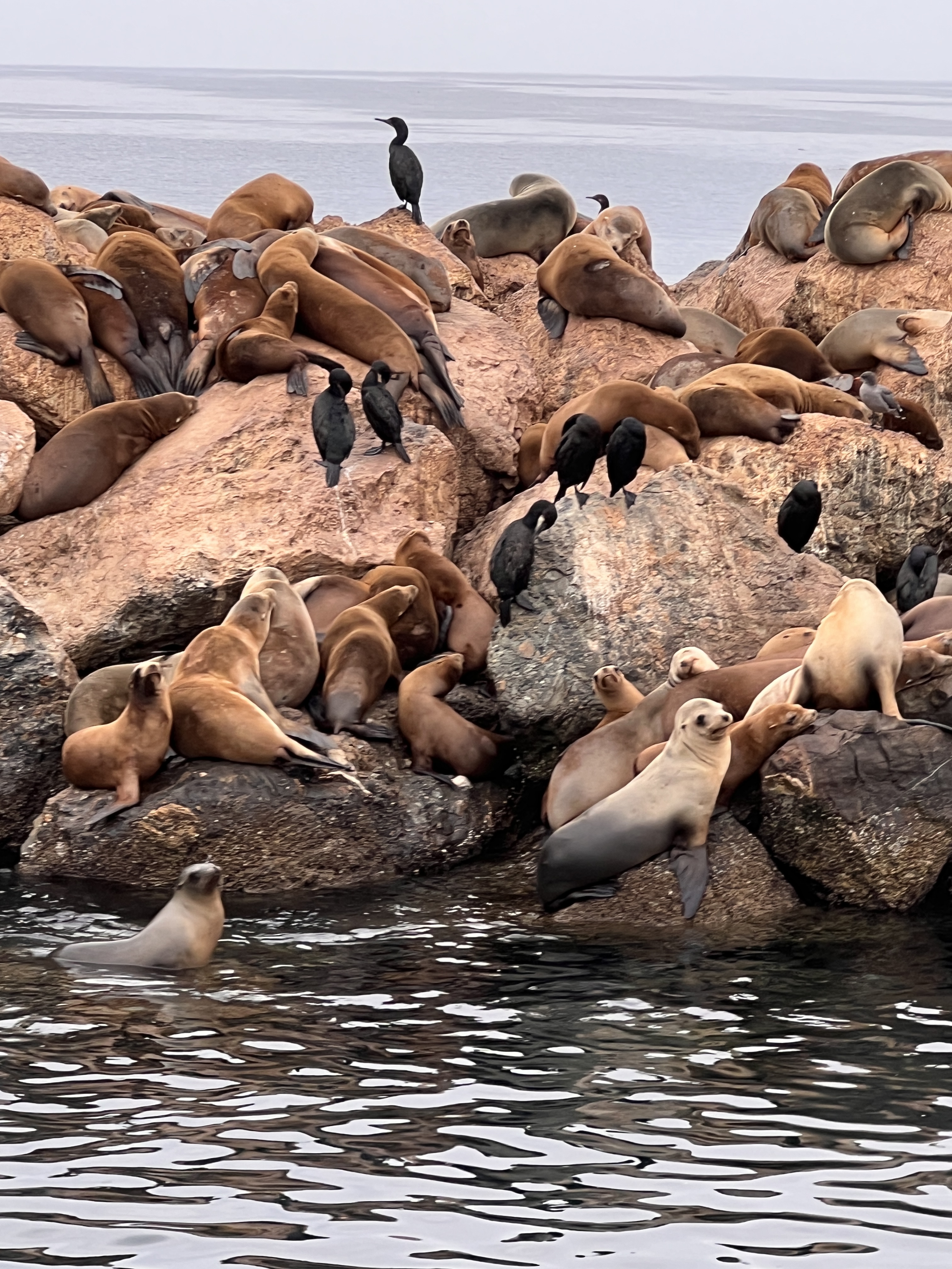 One feature of the harbor that was not so pleasant was the infestation of the breakwaters by hundreds (thousands??) of pelicans. While the pelicans themselves were great and fun to watch, their droppings coated the rocks with a foul patina that had the Perception crew’s fairer members retching as the aroma wafted across the boat. These droppings in turn brought in the flies. Luckily the harbor was large enough that we could anchor away from the stench and buzzing.